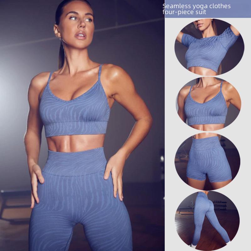 «Новый бесшовный европейский и американский фитнес-комплект: Топ с коротким рукавом, штаны для йоги, спортивный бюстгальтер для женщин.