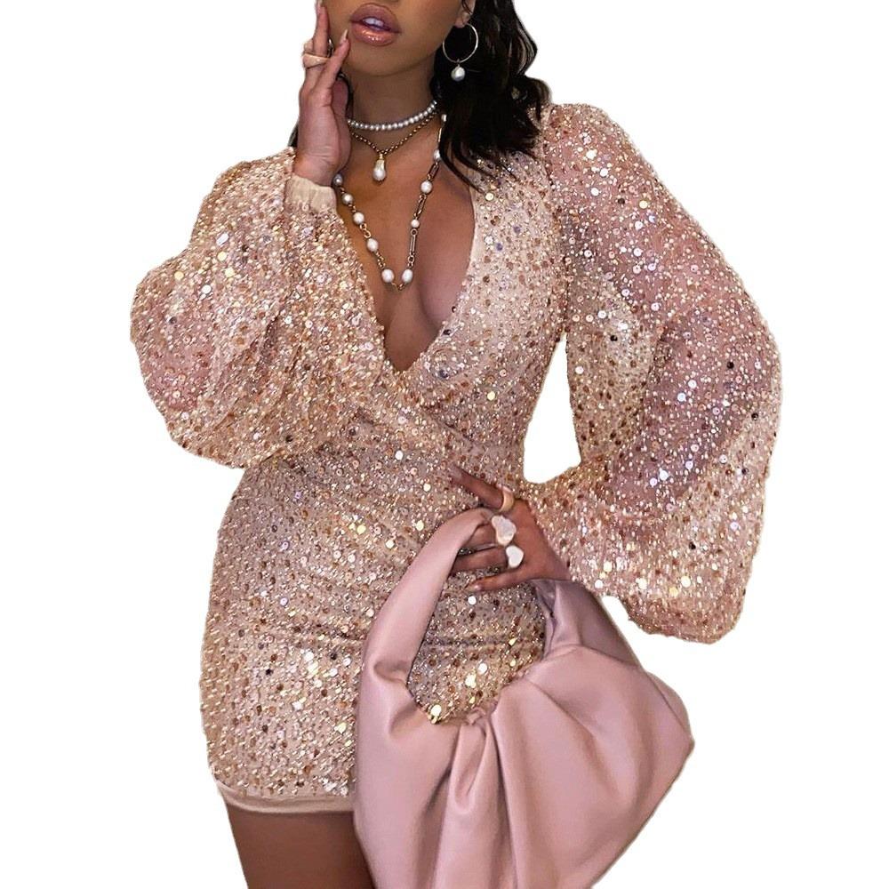 2025 новое женское платье с длинными рукавами, V-образным вырезом, пайетками, юбкой на талии и бедрах