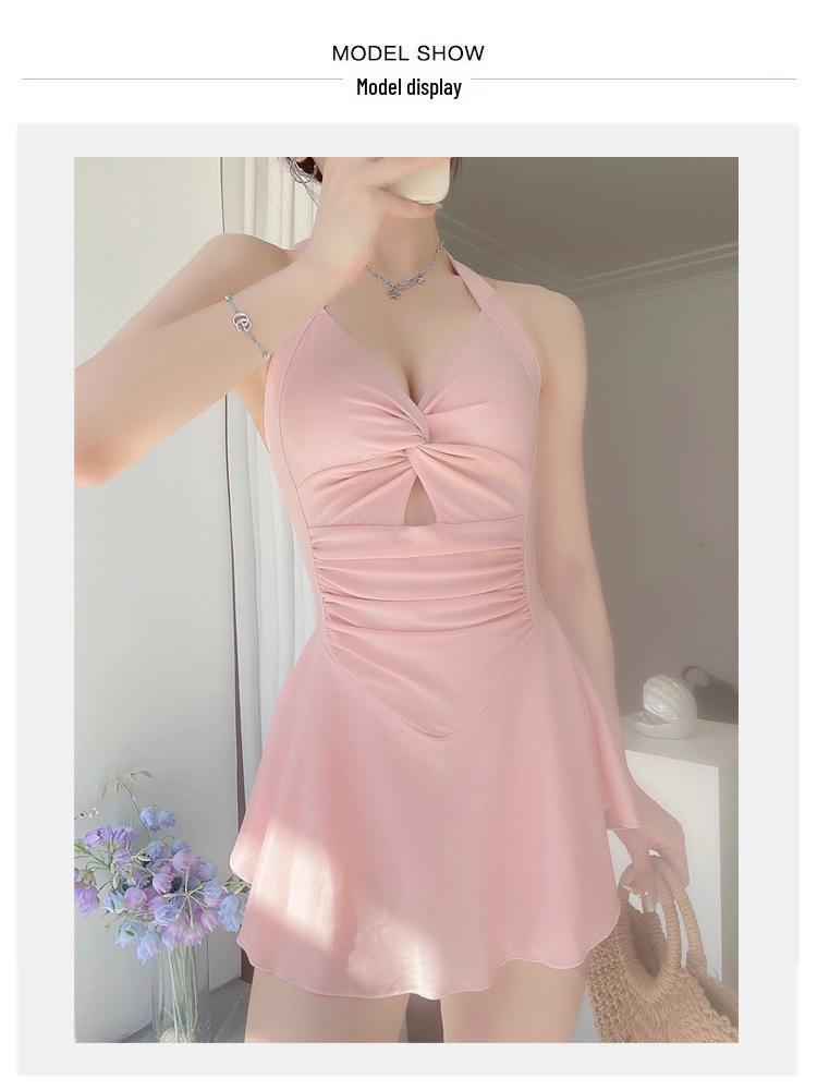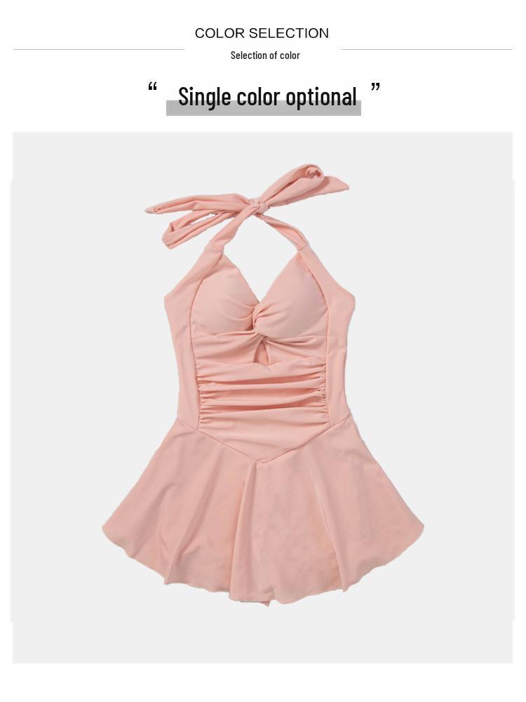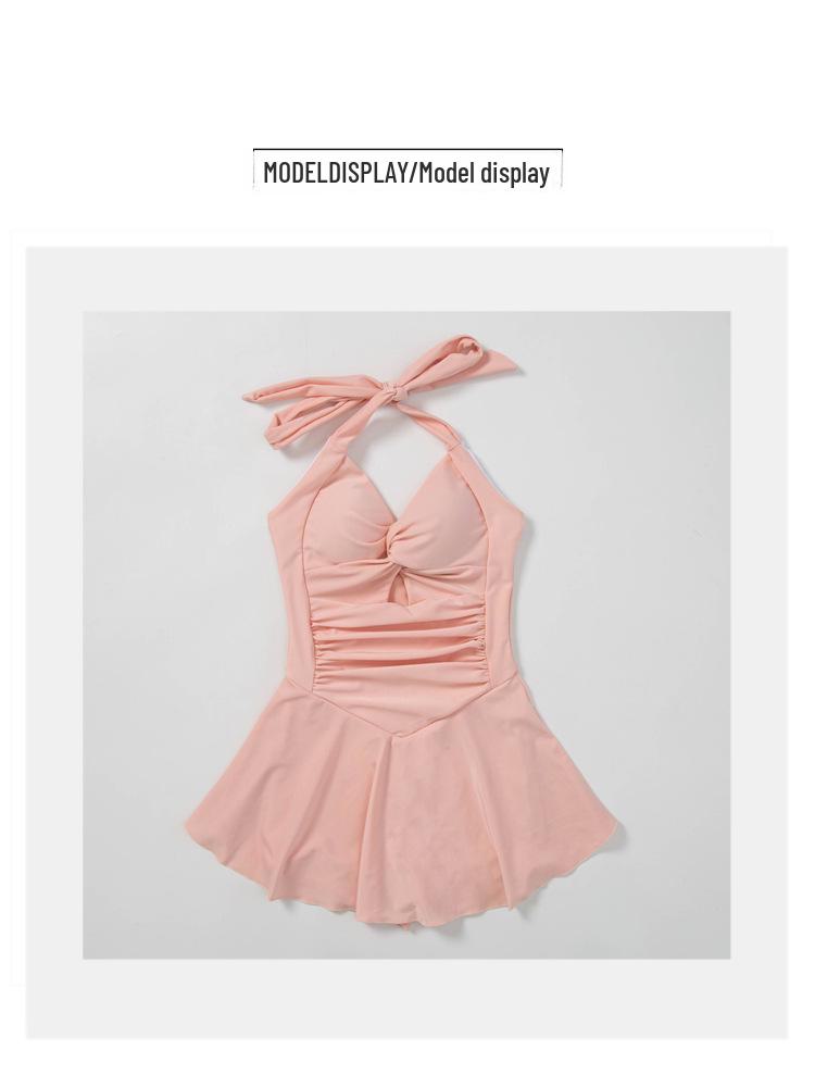 Высококачественный розовый купальник для девочек: Свежий, стильный слитный купальник с халтер-воротником, открытой спиной и закрытой зоной живота.
