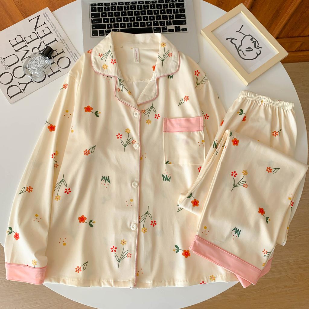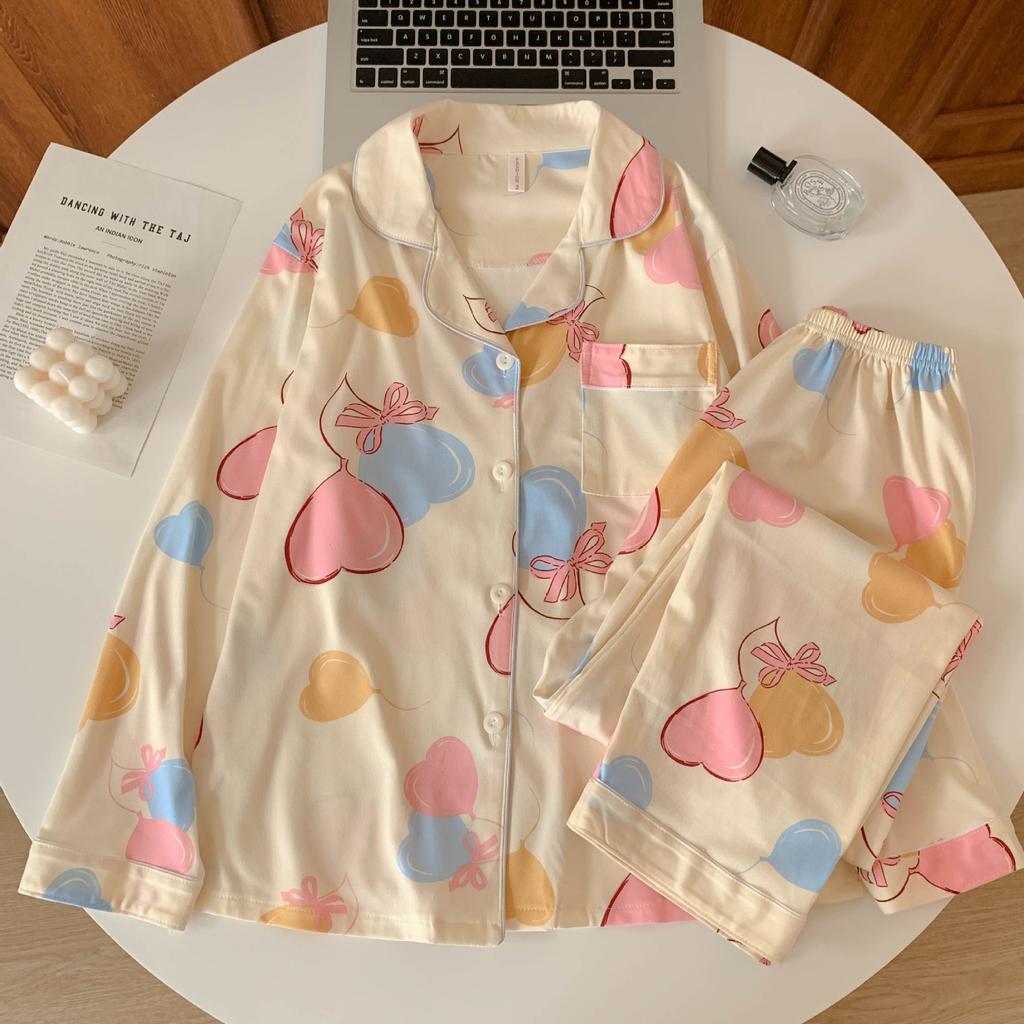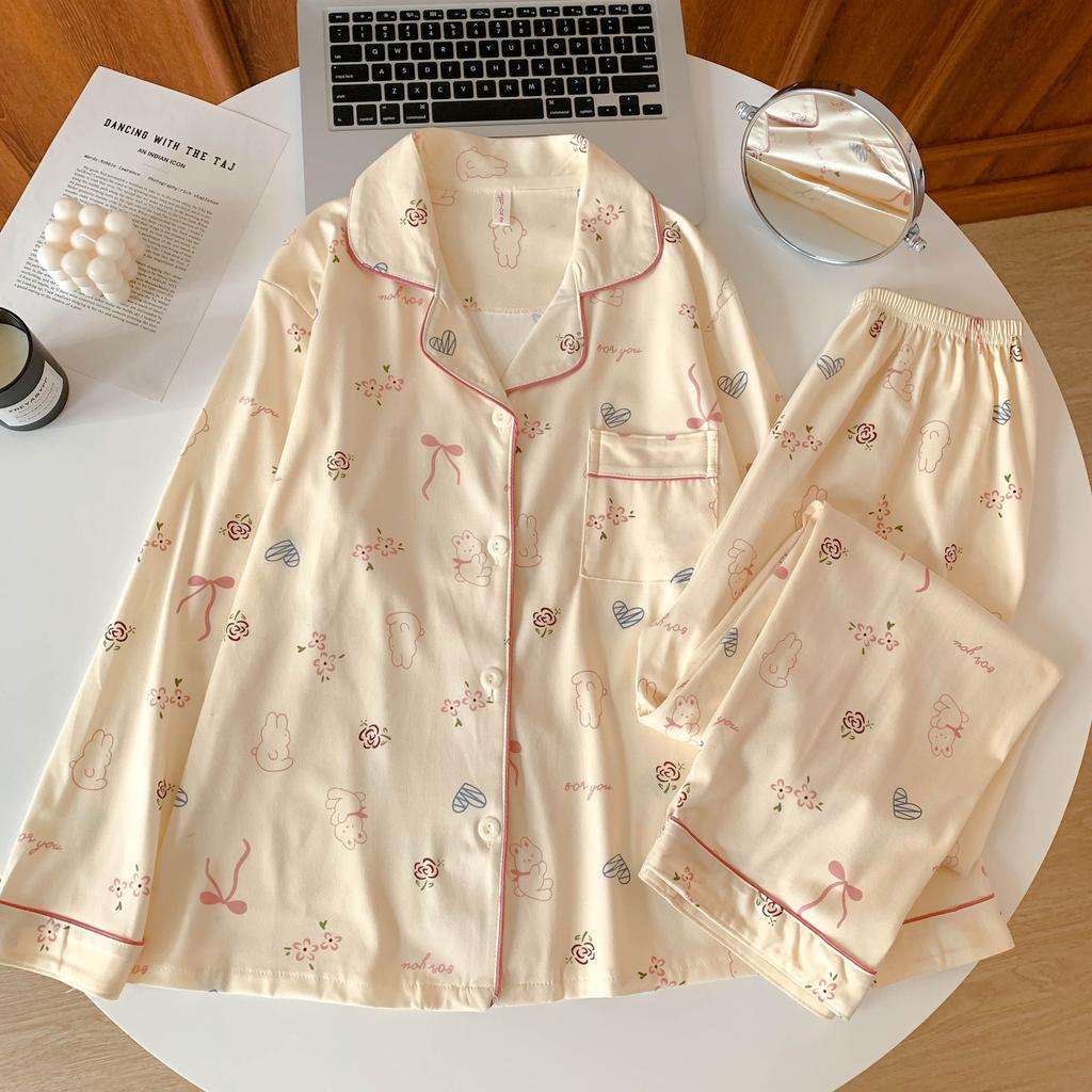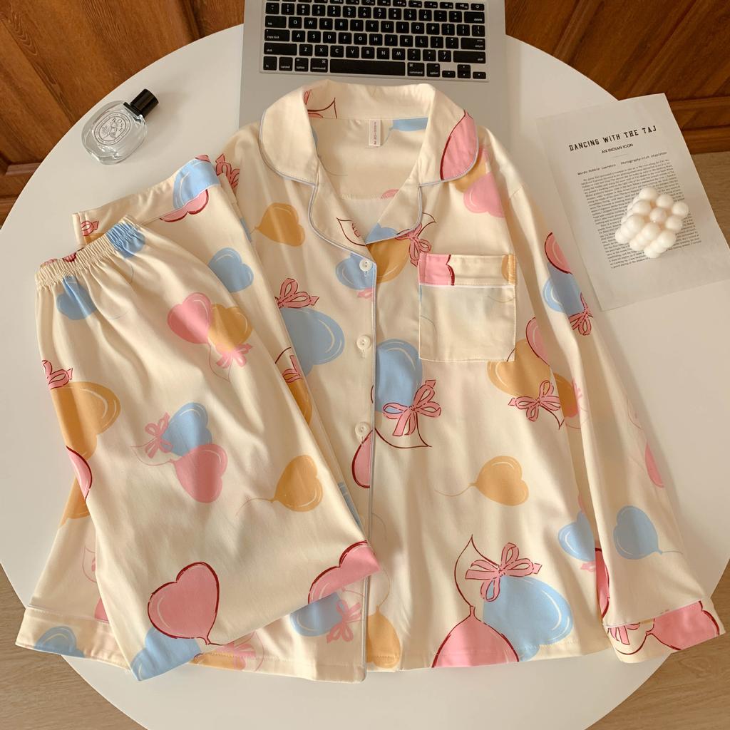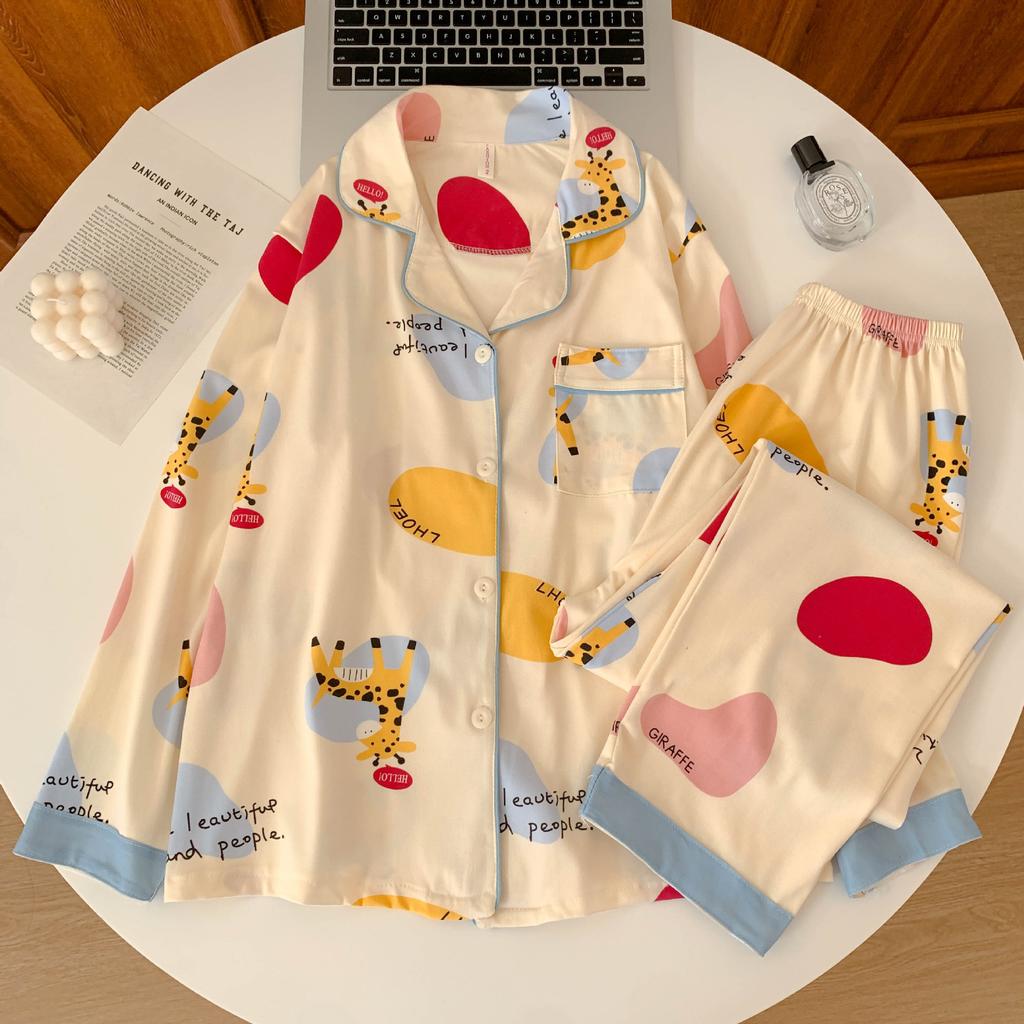 Весенне-осенняя женская пижама с лацканами, комплект домашней одежды для девочек, кардиган с длинными рукавами, длинные брюки, домашняя пижама с рисунком