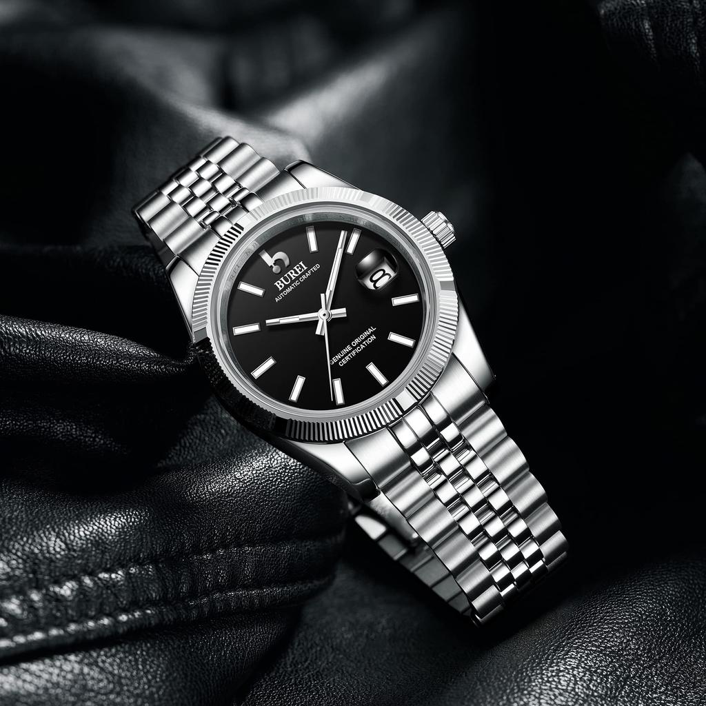 [BUREI] Мужские автоматические часы, механические, водонепроницаемые, аналоговые, популярные, деловые, с датой, брендовые, черные, стильные, простые, светящиеся часы