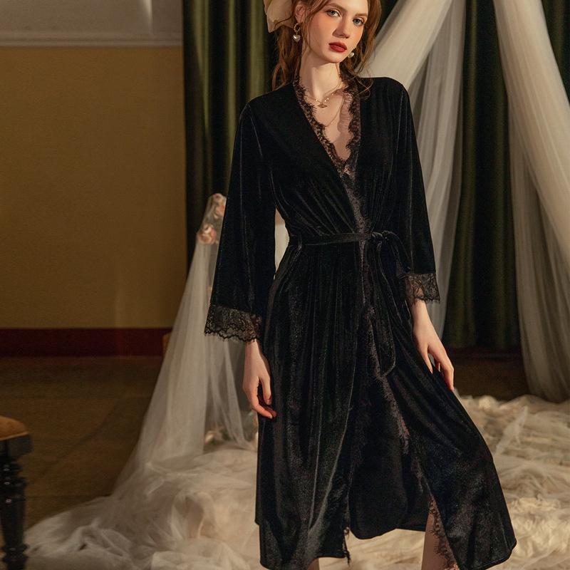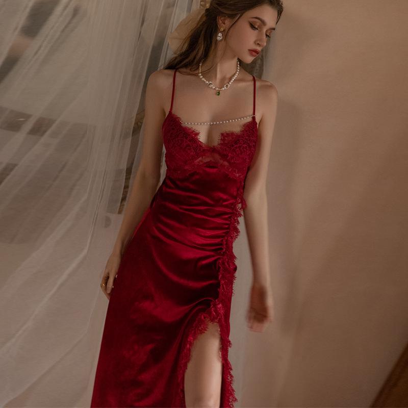 Сексуальная бархатная ночная рубашка с открытой спиной, кружевом с ресничками и занавесками из бисера, женская длинная пижама-комбинация