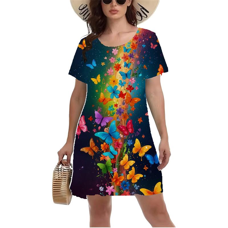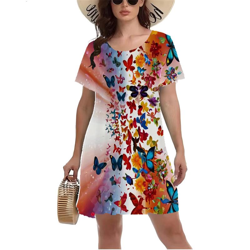 Платье с принтом 3D красочных бабочек, летнее, с коротким рукавом, О-образным вырезом, повседневные платья А-силуэта, модное женское пляжное платье для отдыха, Vestidos