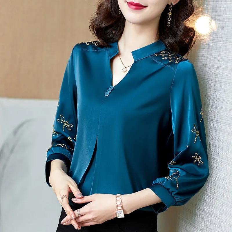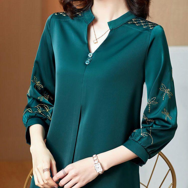 Весна и лето Большой размер Свободная и тонкая футболка Женская рубашка с V-образным вырезом и вышитым рукавом три четверти