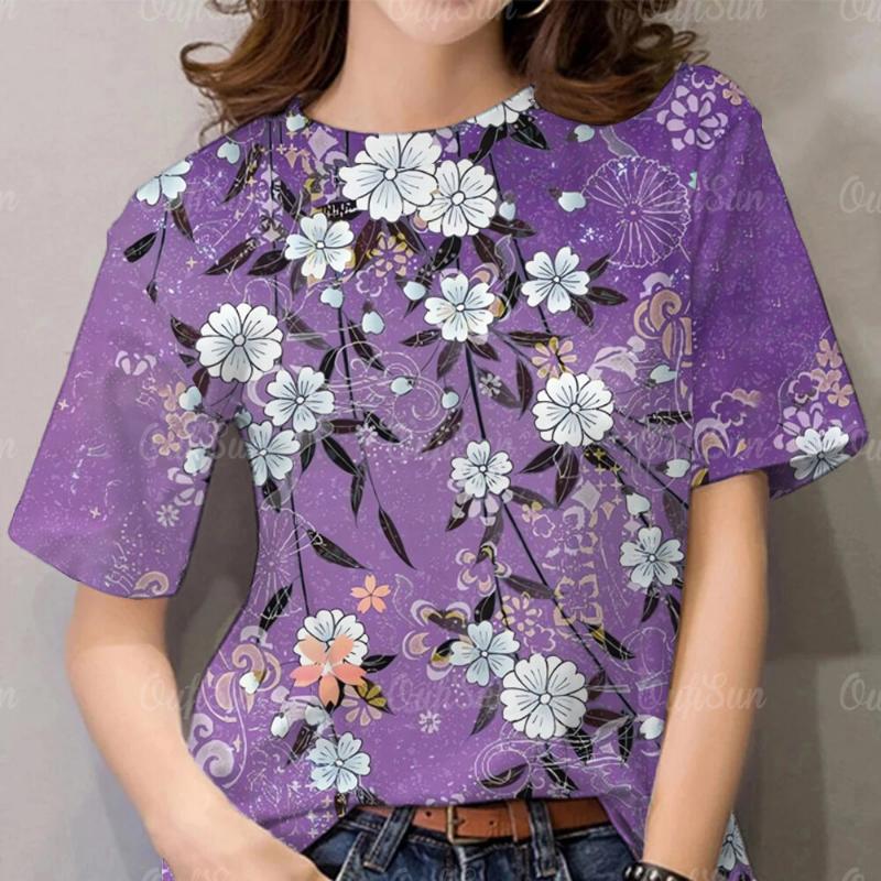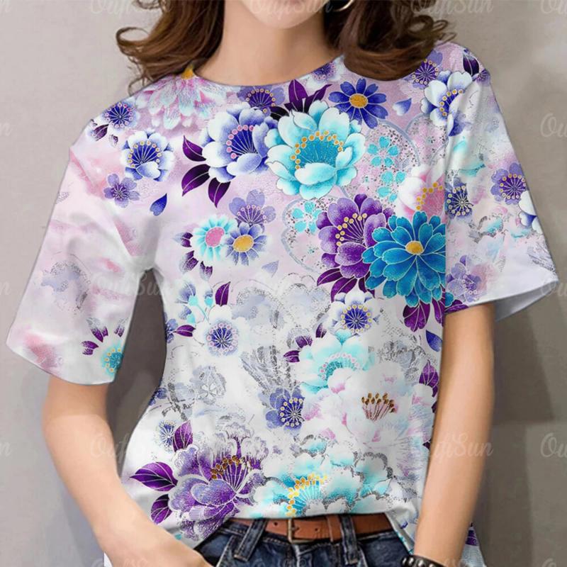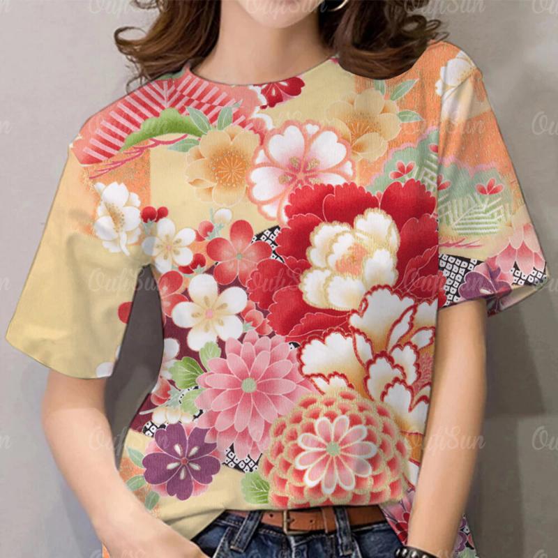 Футболка с цветочным принтом Женская футболка Летняя повседневная одежда Harajuku Футболка Hundred Street Дышащий топ