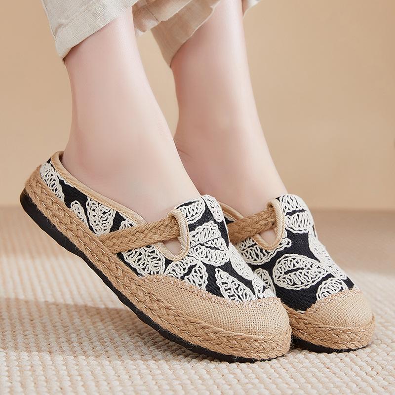 Туфли из ткани женские туфли 2025 лето новые льняные тканые вышитые тапочки полуоблегающие повседневные туфли женские туфли