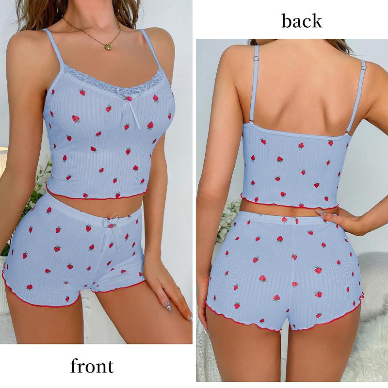 Женский комплект из 2 предметов пижамы с кружевной отделкой и принтом, топ на бретельках и шорты для отдыха, женские комплекты с принтом клубники, одежда для сна
