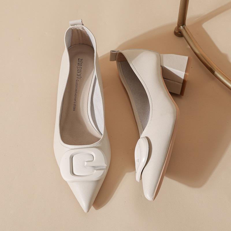 Кожаные толстые каблуки высокие каблуки женственные туфли мягкие кожаные удобные не устающие ноги одинарные туфли бежевые