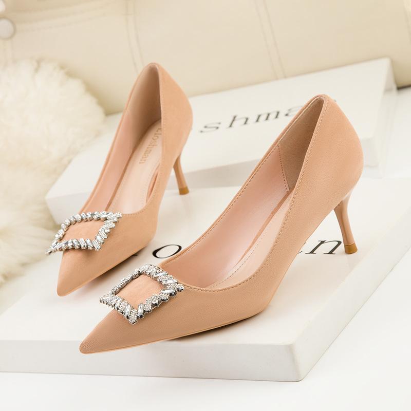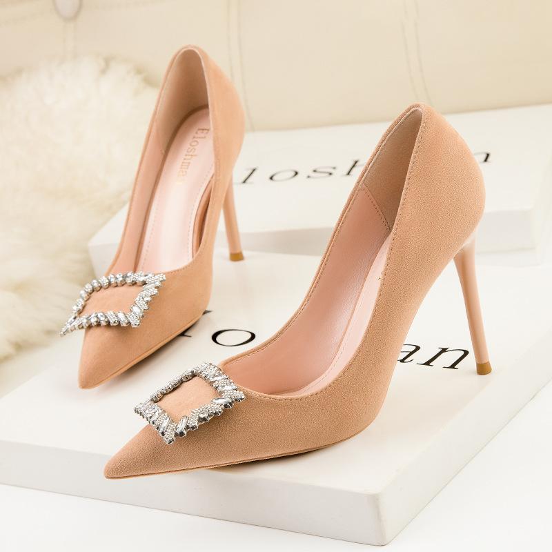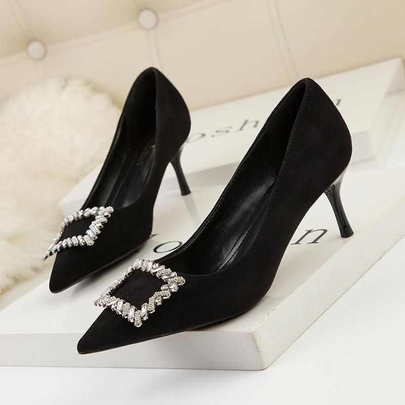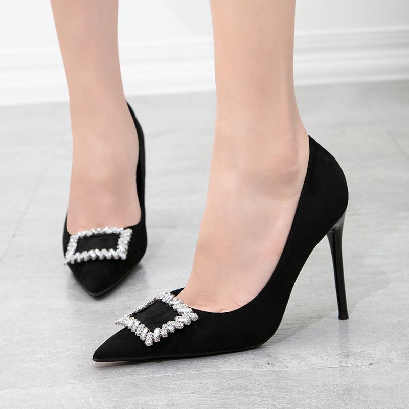 Модные женские туфли на тонком каблуке с высоким каблуком, с заостренным носком и тонкой металлической квадратной пряжкой, одинарные туфли