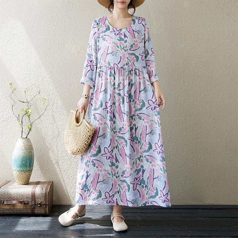 Осеннее литературное платье больших размеров из хлопка и льна с принтом, круглым вырезом и длинными рукавами для женщин, платья