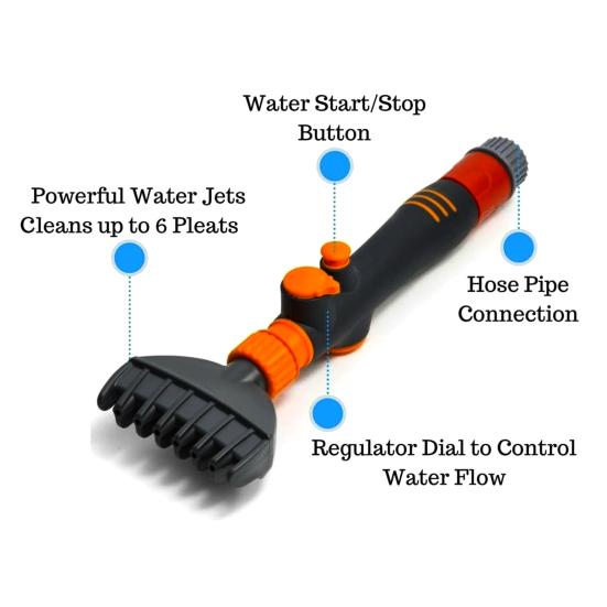 Гребенчатая насадка создает мощную струю воды, которая быстро удаляет мусор, листья, масло и грязь из сердечника фильтра, гарантируя, что через фильтр вашего бассейна или джакузи будет проходить только чистая вода.. За считанные секунды этот очиститель фильтра для бассейна восстановит работоспособность вашего фильтра, обеспечив бесперебойную циркуляцию воды.