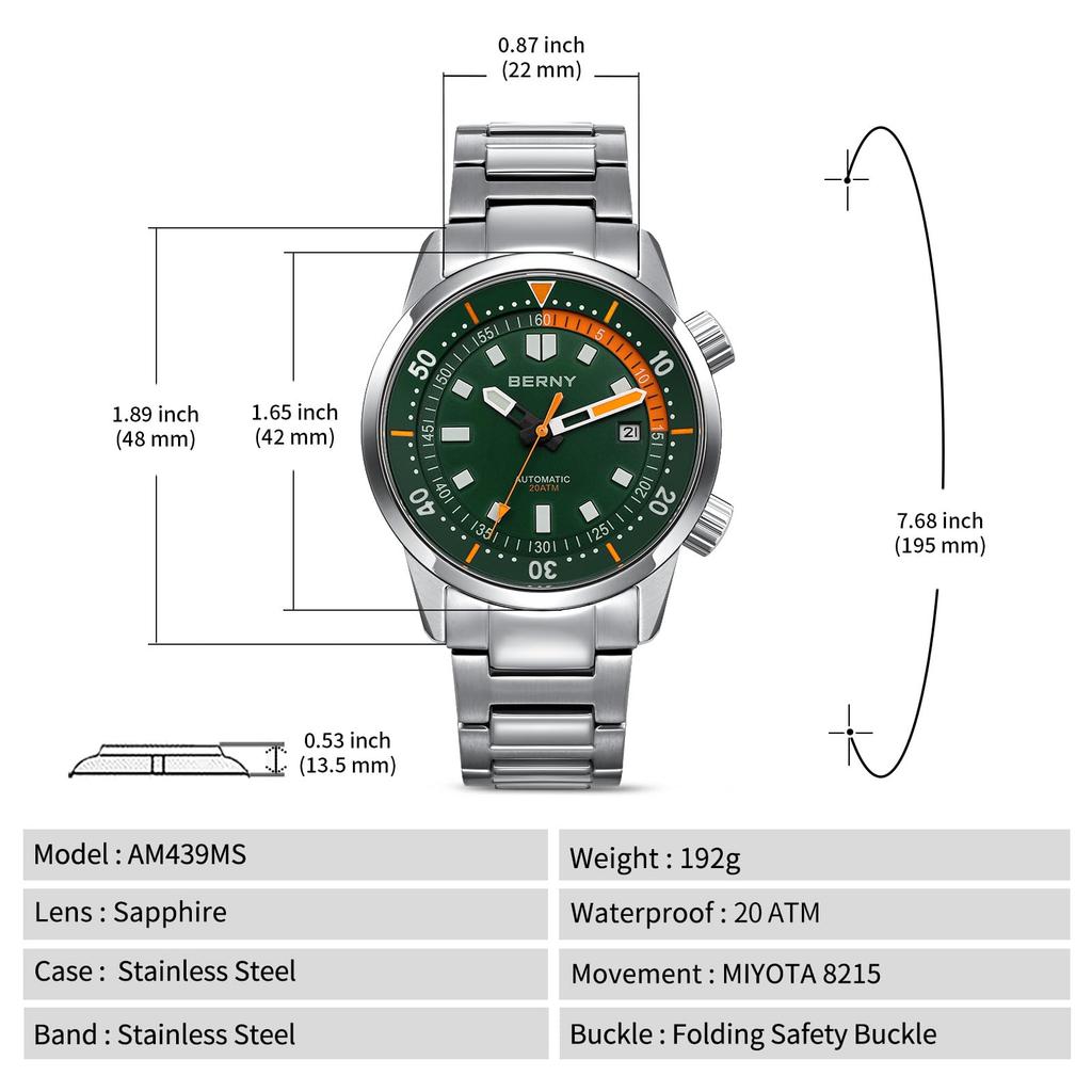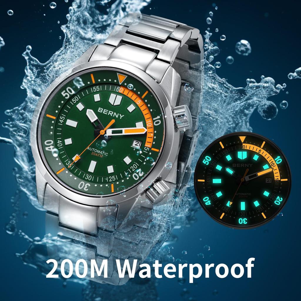BERNY Watch Automatic Watch Diving Watch Automatic Mechanical Watch 20ATM Waterproof Sapphire Glass Super Luminous Watch Diver's Men's Men's Diver's