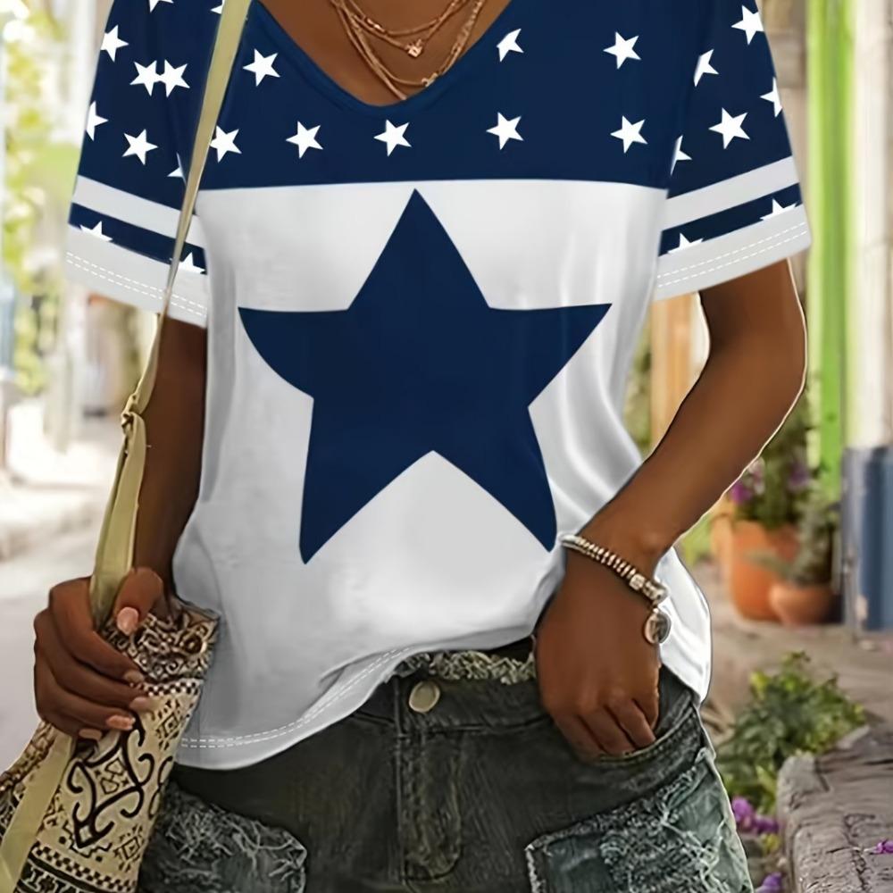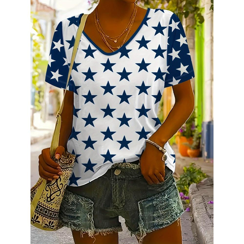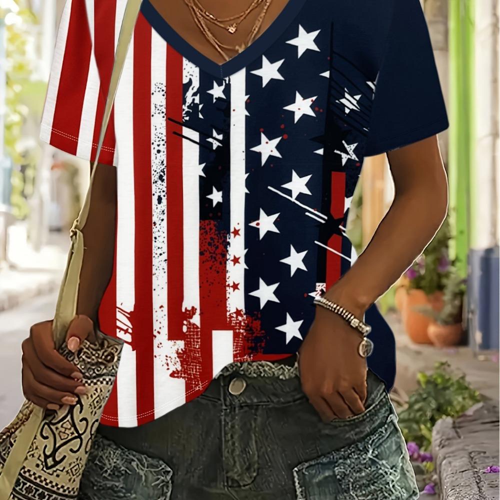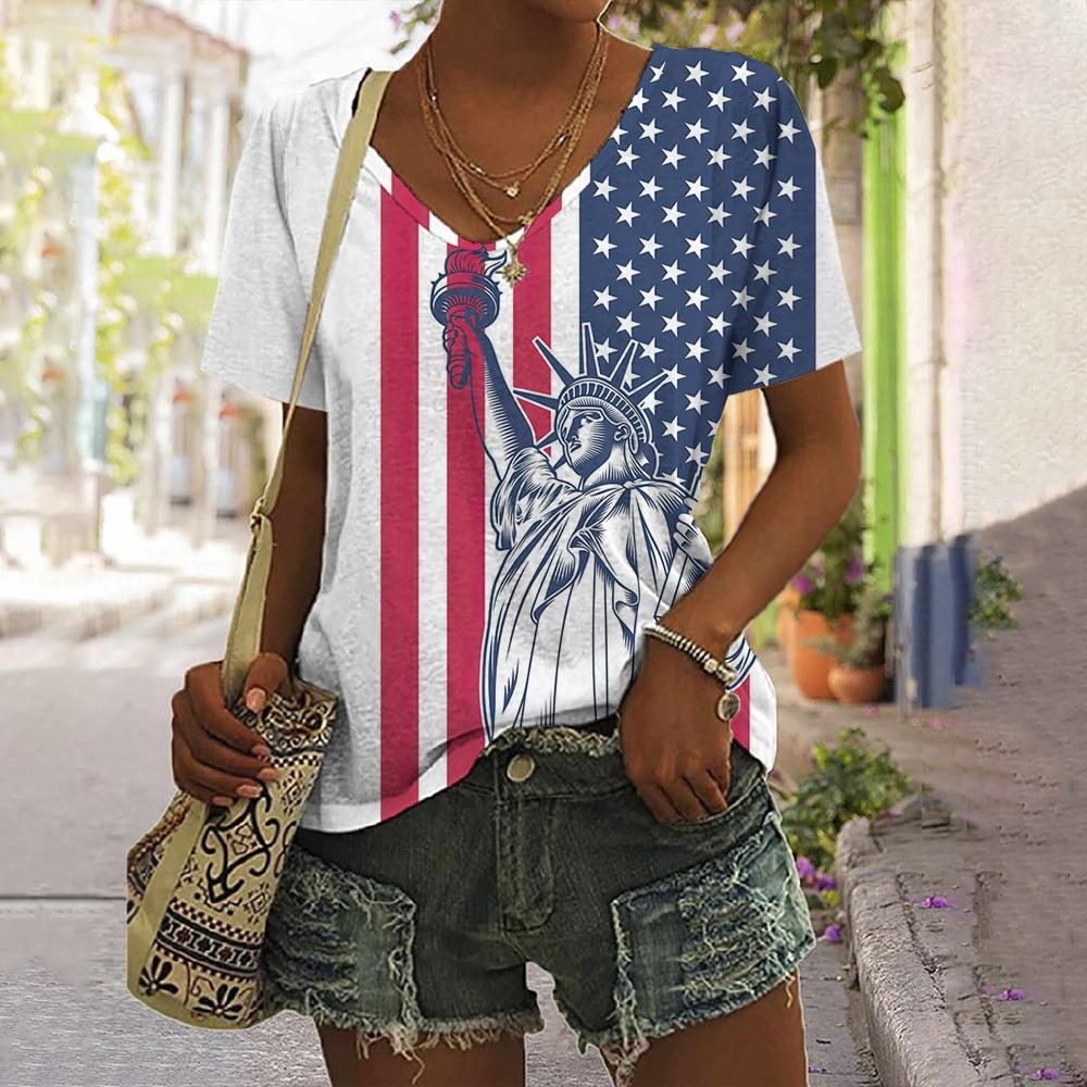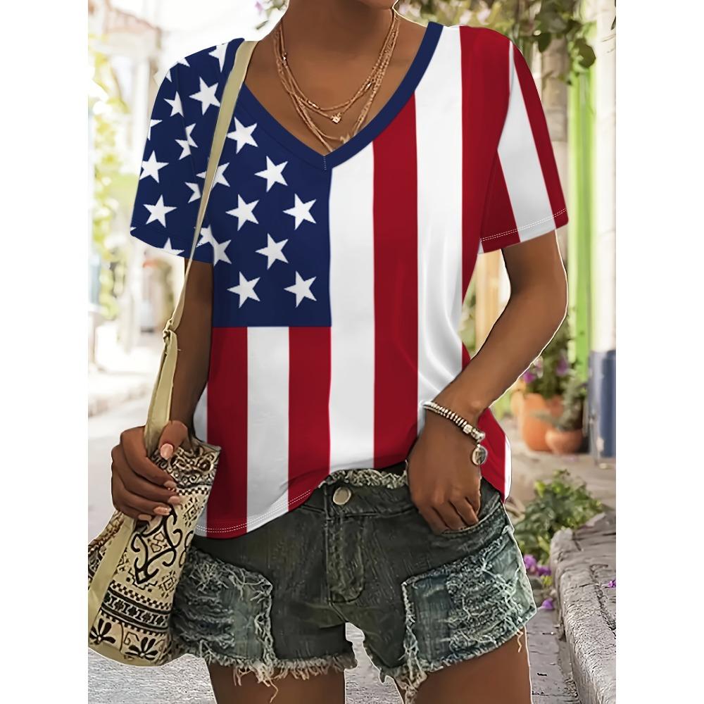 Женская футболка со звездным принтом, топ больших размеров с американским флагом, летняя женская трендовая одежда, рубашка с коротким рукавом, блузка с V-образным вырезом