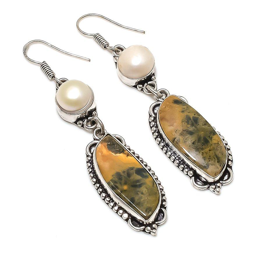 Натуральный Медовый Дендритный, Жемчуг 925 Стерлинговое Серебро Ювелирное Изделие Серьга 2.84" n2Q79
