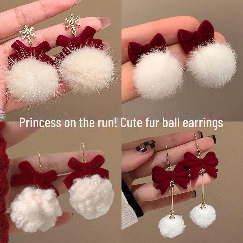 2024 Красные бархатные плюшевые серьги-бантики: Уникальный дизайн мехового шарика осень-зима для женщин