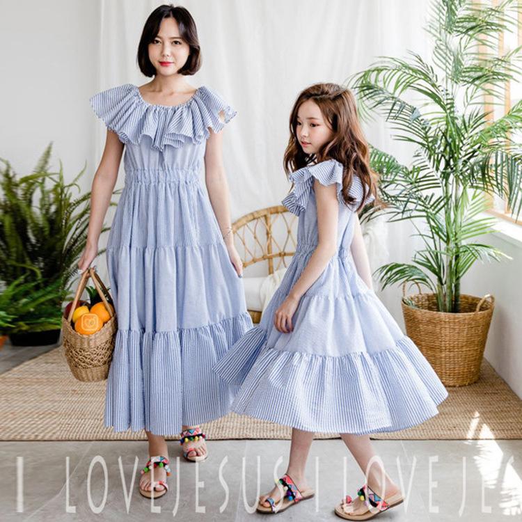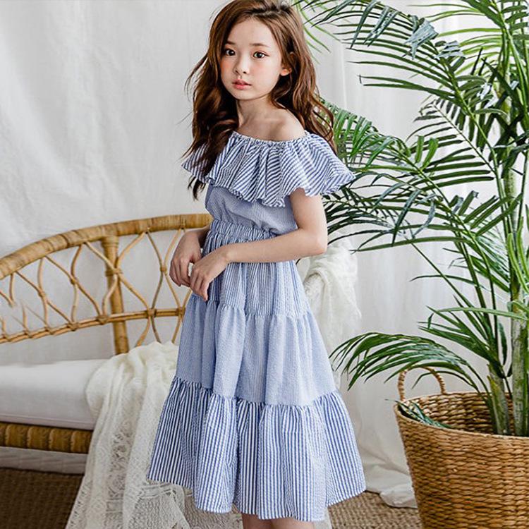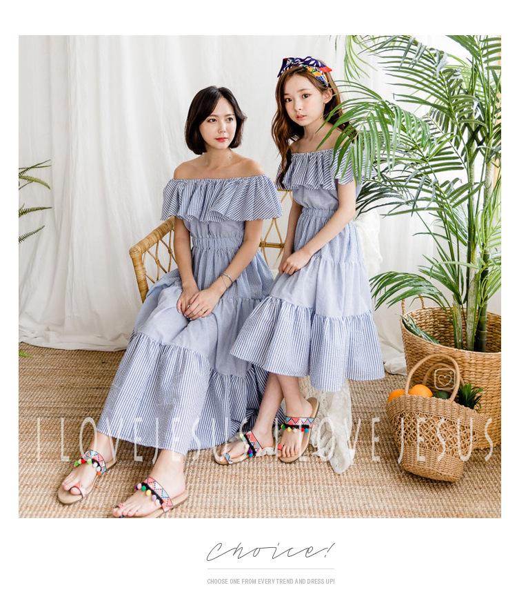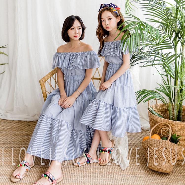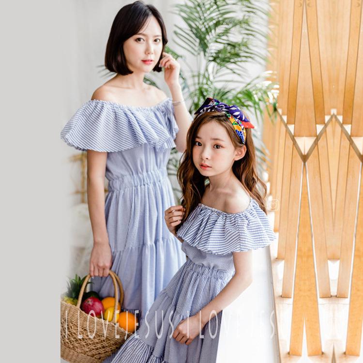 Летнее пляжное платье в полоску из хлопка в корейском стиле для девочек с открытыми плечами и широкими складками 2023 г. - Доступны модели для родителей и детей