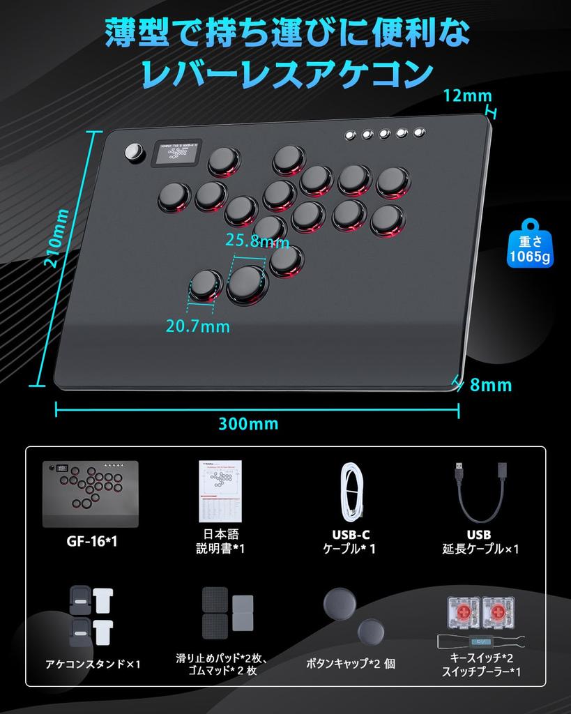 [🏆Содержимое упаковки GF-16 black] Размеры изделия 300*210*12 мм, вес 1065 г. ① Кабель USB-C x 1, ② Удлинительный шнур USB x 1, ③ Подставка x 2, ④ Противоскользящая накладка x 1, ⑤ Резиновый коврик x 1, ⑥ Колпачок кнопки x 2, ⑦ Резиновый колпачок x 1, ⑧ Винт x 2, ⑨ Ключ-переключатель x 2