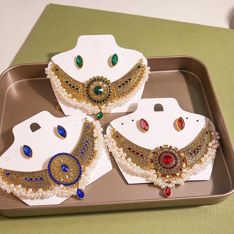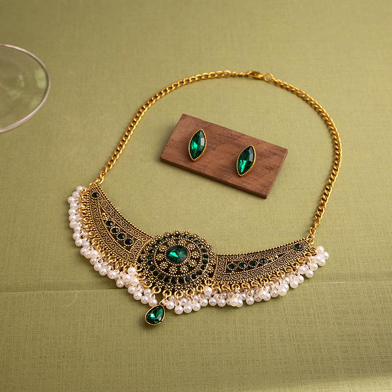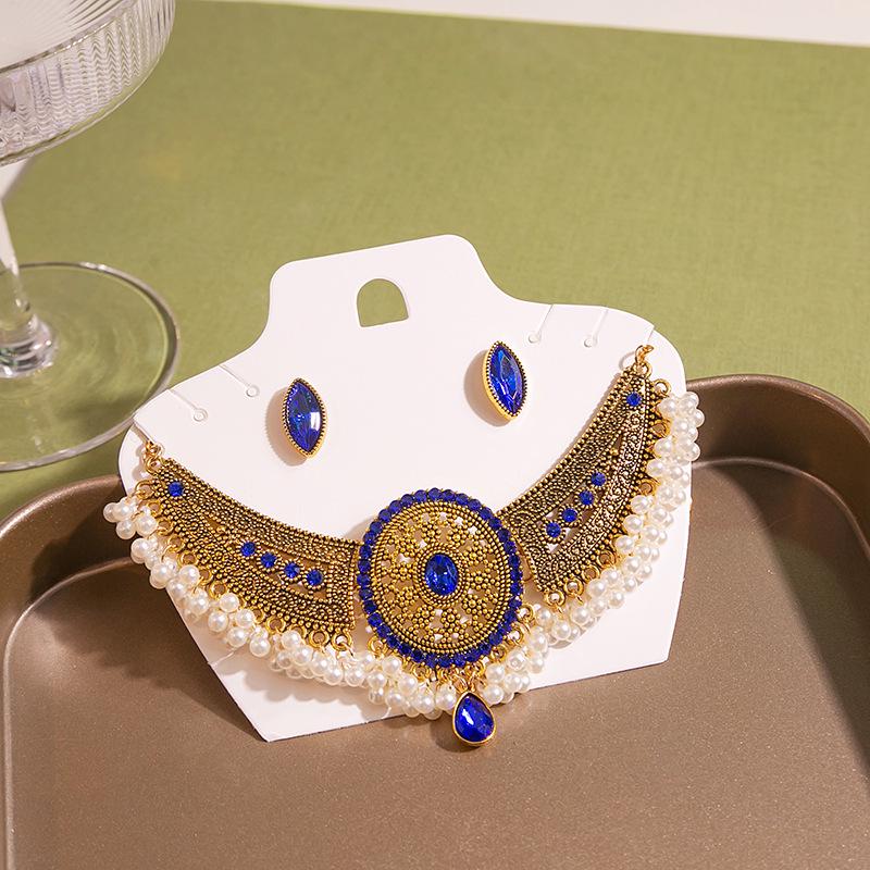 Комплект из колье и серег в стиле бохо с круглыми бриллиантами и жемчугом