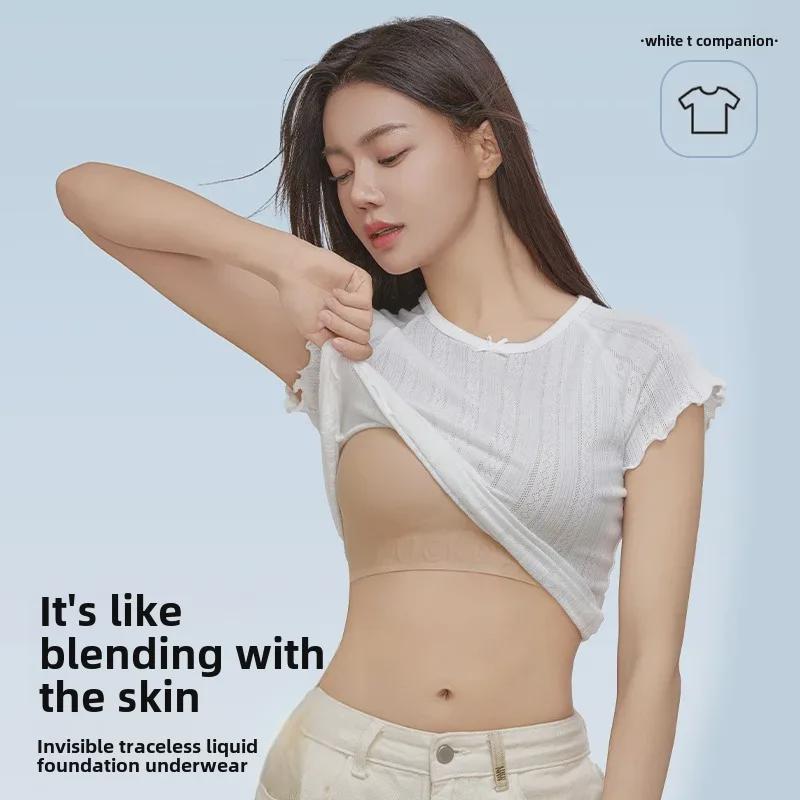 Женский летний бесшовный цельный топ телесного цвета с невидимым бюстгальтером — тонкий, удобный и непрозрачный.