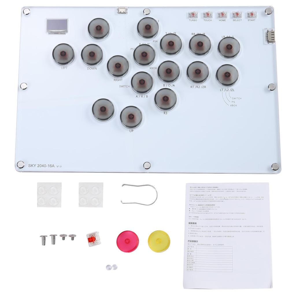 Содержимое пакета: Размеры изделия 295*190*12мм, вес 940г.. Размер удобен для игры на коленях! Игровой контроллер T16 (16 кнопок) x1, USB-кабель x1, кнопка V4 x1, рычаг переключения x1, колпачок кнопки 6 мм x2, противоскользящая накладка x8, руководство пользователя на японском языке x1, запасные винты