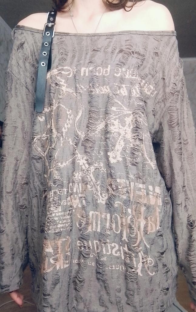 Эта кофточка представляет собой интересный образец одежды, который сочетает в себе элементы повседневного комфорта с выразительными деталями, характерными для гранж или альтернативного стиля. 🔸На выбор парочка расцветок, размеры: S-XL. На мне L. - Замеры изделия: Длина - 71 см ОГ - 114 см Ширина плеч - 50 см Длина рукава - 57 см 🔸Кофточка выполнена из легкой ткани светлого цвета. Ткань имеет явную "изношенную" текстуру с множеством мелких горизонтальных и вертикальных рубчиков, что придает ей вид состаренной или потертой. Это создает эффект гранжа и добавляет непринужденности образу. 🔸Кофточка имеет свободный, немного мешковатый крой, что обеспечивает комфорт и расслабленный вид. Рукава также свободные и длинные. 🔸Широкий вырез позволяет носить ее, спуская одно плечо. Это добавляет элемент асимметрии и легкой небрежности. 🔸Отличительной особенностью является черный ремень с металлическими люверсами и пряжкой, прикрепленный к одному плечу. Эта деталь напоминает элементы стиля панк или готика и служит как функциональным, так и декоративным акцентом, подчеркивая асимметрию выреза. 🔸Центральное место на кофточке занимает крупный графический принт черного цвета. Он выполнен в стиле, напоминающем готическую каллиграфию, обрывки текста, символы и абстрактные рисунки. Рекомендую 👍 Ставлю ⭐ ⭐ ⭐ ⭐ ⭐ Спасибо продавцу ❤️ и Joom ❤️