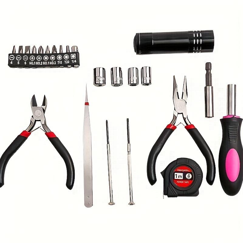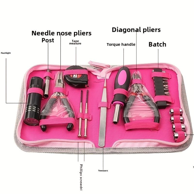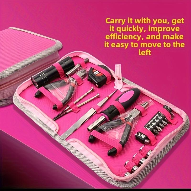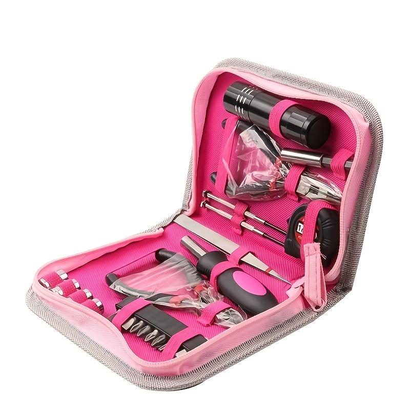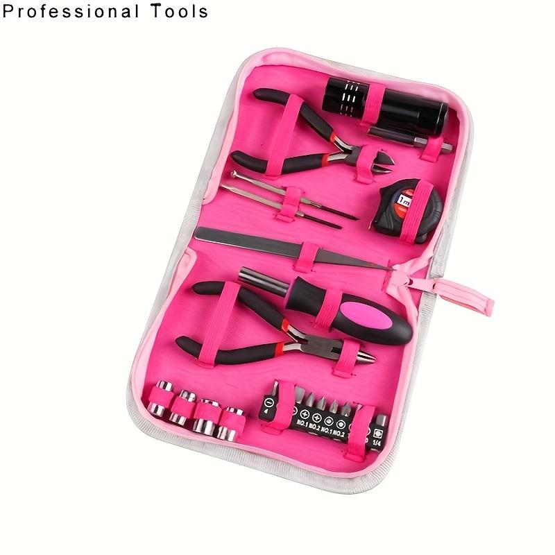 Женский набор инструментов для домашнего ремонта из 23 предметов, включая ящик с ручными инструментами для сборки мебели и обслуживания бытовой техники.