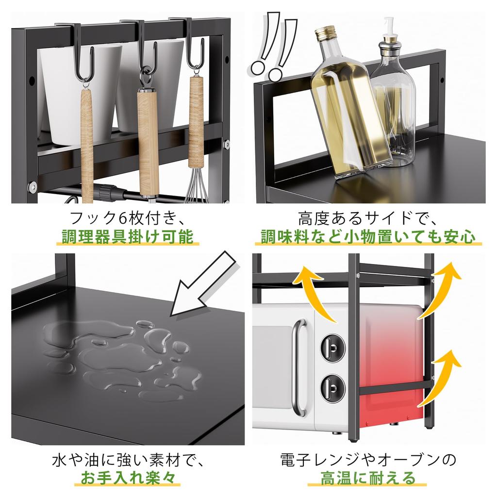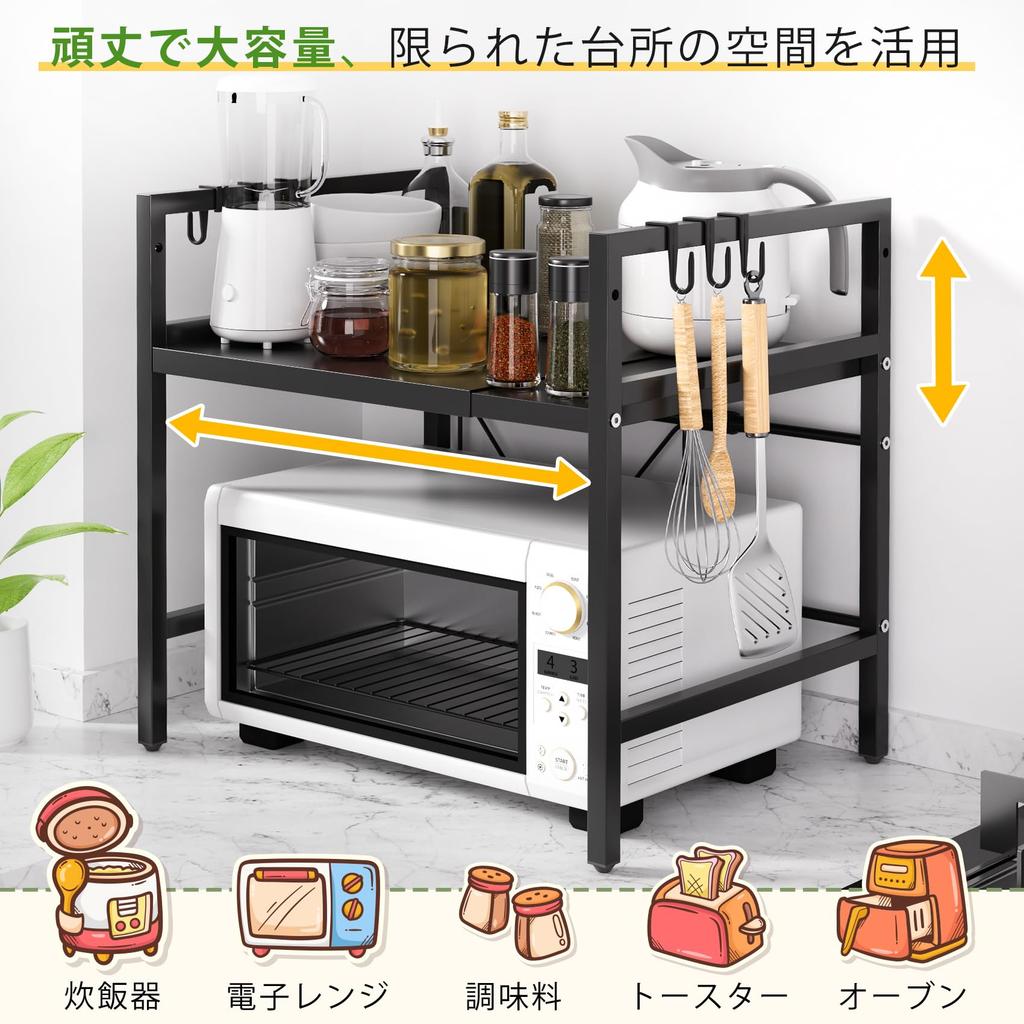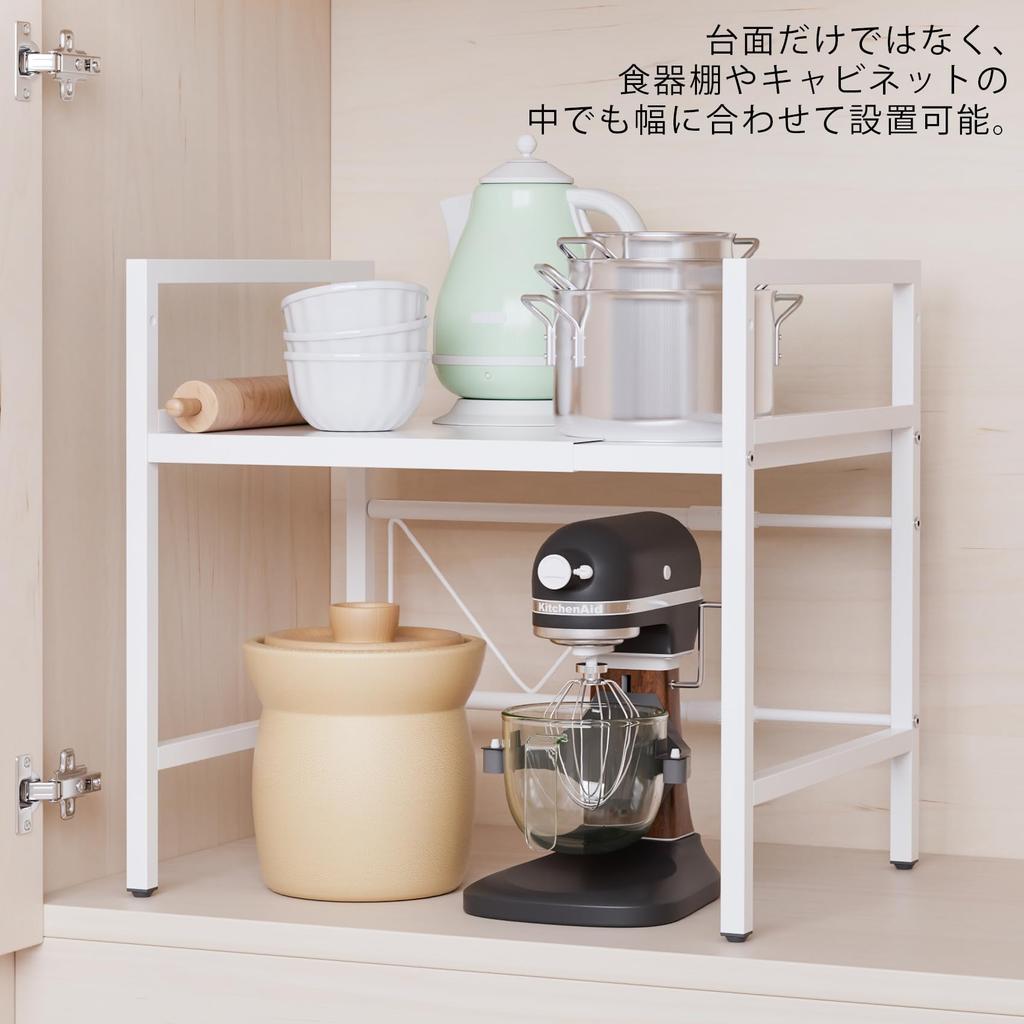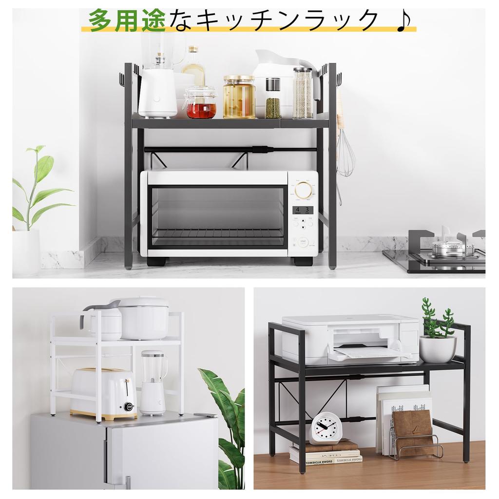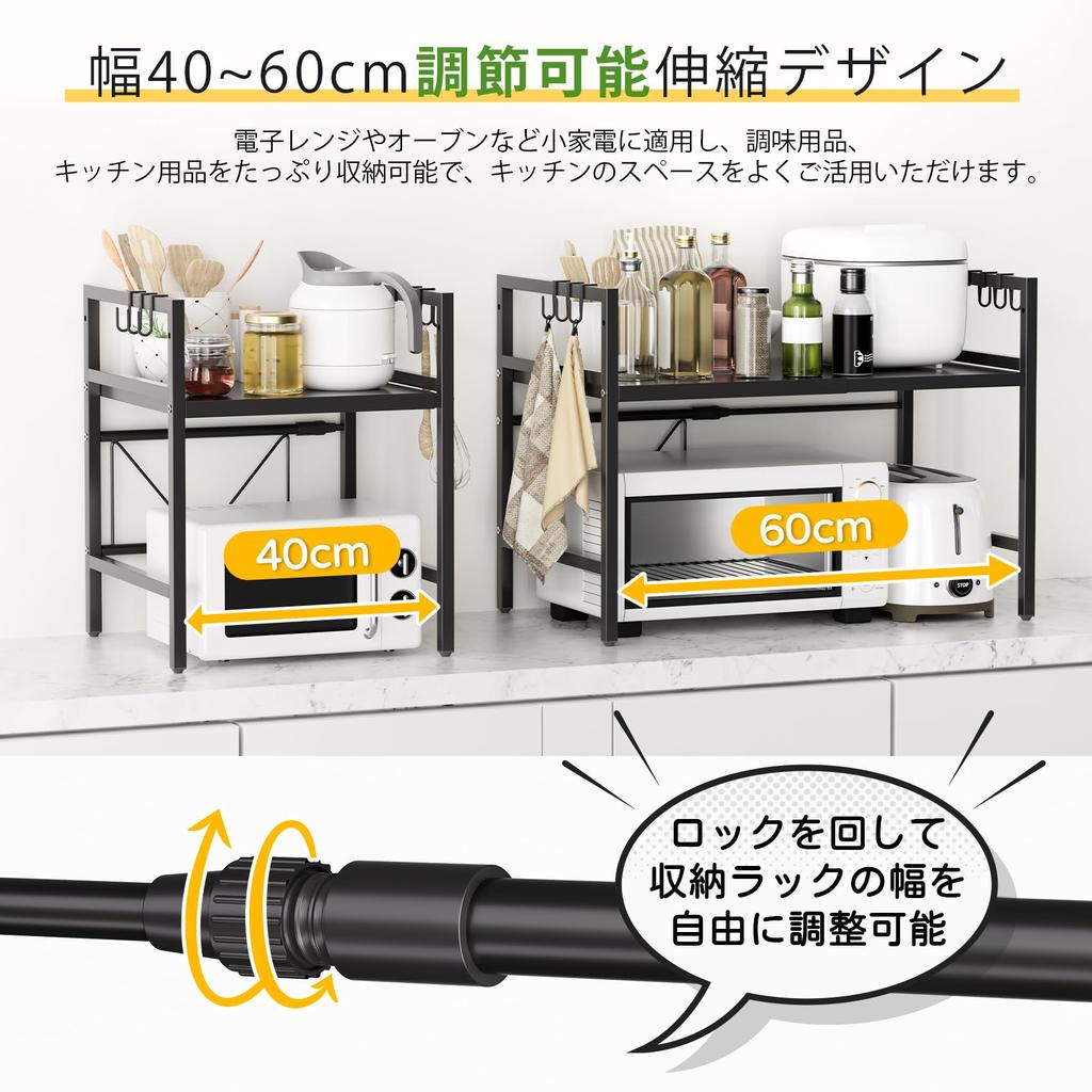 [Ширина 36~60 см, выдвижная] Ширину полки для хранения микроволновой печи можно плавно регулировать в диапазоне примерно 36~60 см. (внутреннее измерение), а ширину стойки можно свободно регулировать, поворачивая фиксатор на телескопической штанге.. Поместив тостер, духовку, рисоварку, приправы и т. д.. все вместе вы можете расширить пространство для приготовления пищи и повысить эффективность ее приготовления.