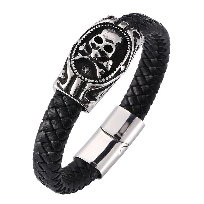 Панк кожаный браслет для мужчин Череп скрещенные кости браслет Шарм нержавеющая сталь браслеты модные мужские украшения