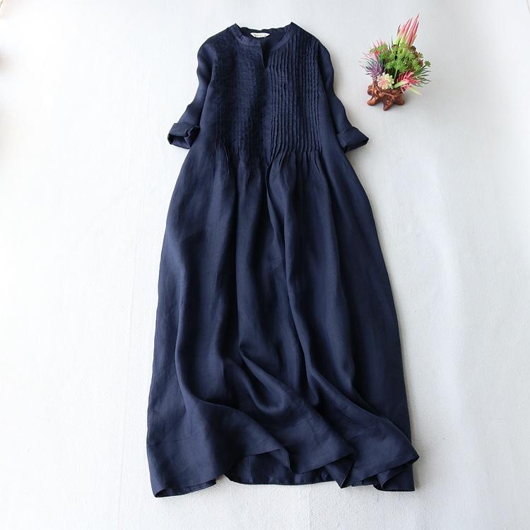 Платье из хлопка и льна, женское, с небольшим воротником-стойкой, элегантное, с плиссировкой, рукавом семь четвертей, свободное и элегантное, однотонное, длинное летнее платье — купить товар онлайн с бесплатной доставкой до всему миру!