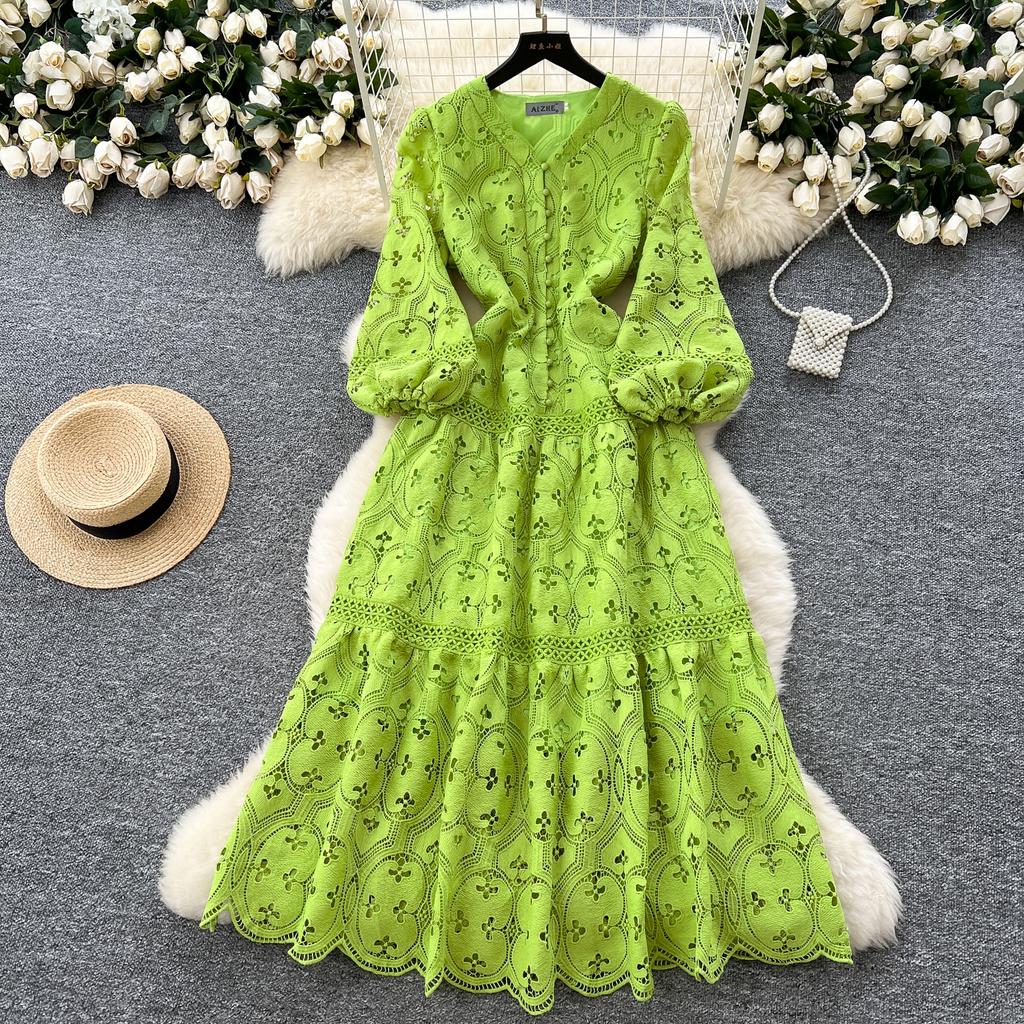 Весна-лето Женские V-образные вырезы с рукавами-фонариками Вышитые кружевные длинные макси вечерние платья