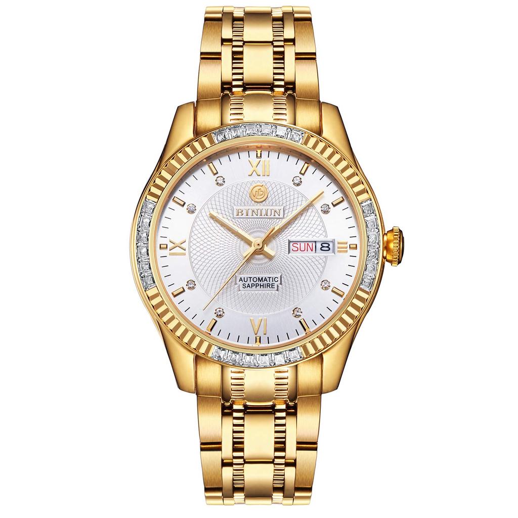 BINLUN Золотые Автоматические Часы Золотые Механические Скелетон Бизнес Часы Водонепроницаемые Аналоговые из Нержавеющей Стали Роскошные Часы для Мужчин Мужские Мужские [Продукт]