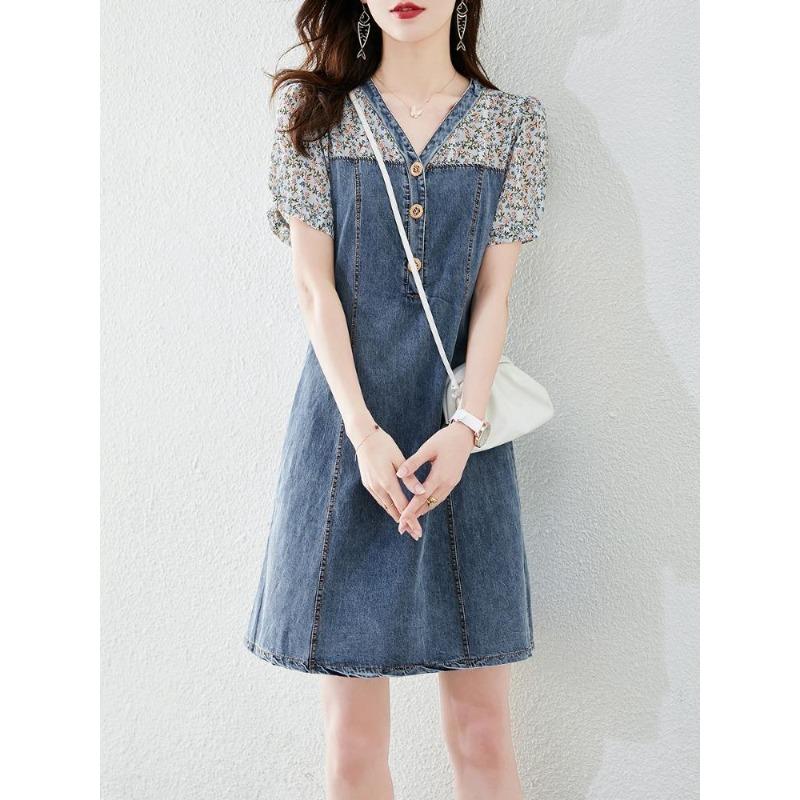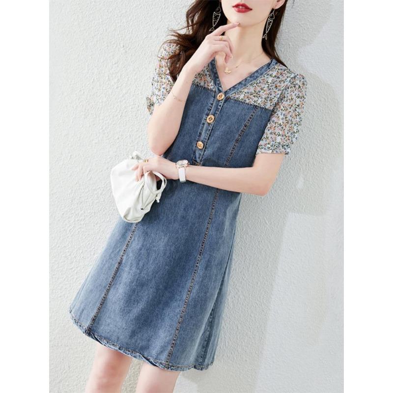 Французское поддельное джинсовое платье из двух частей для женщин на лето, новый дизайн, нишевая юбка с короткими рукавами и цветочным принтом