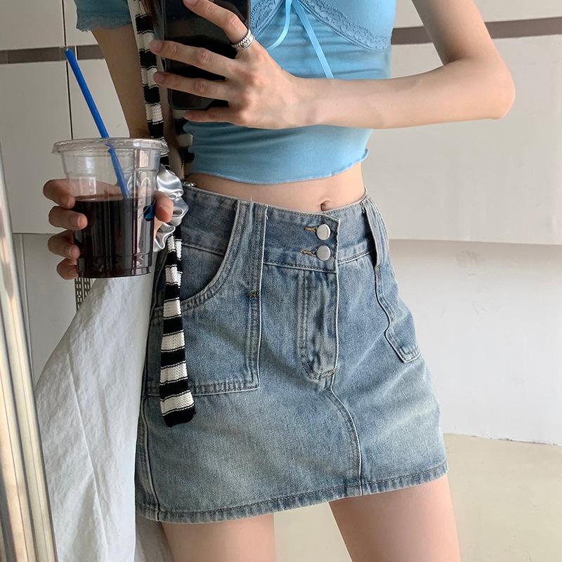 Юбка для стройности и молодости, короткая юбка, тонкий дизайн, двойная пряжка, высокая талия, ретро-трапеция, юбка до бедра, женская летняя модная джинсовая короткая юбка