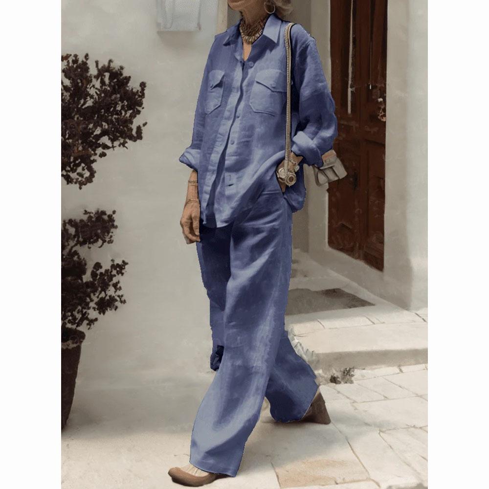 Модная рубашка из 2 предметов для женщин, осенняя блузка с длинным рукавом и карманами, брюки, женский повседневный костюм