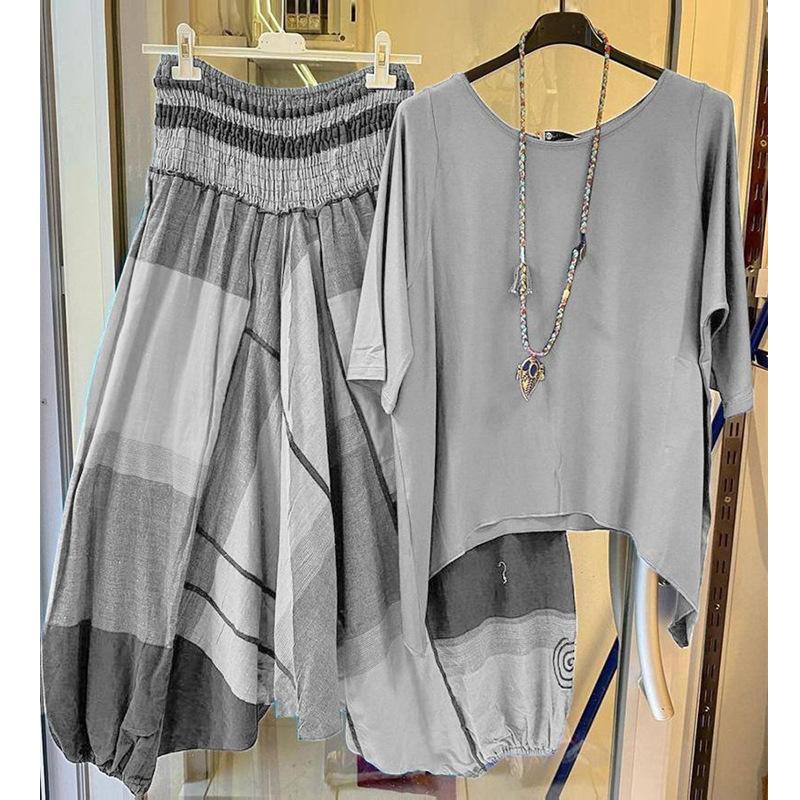 1 комплект футболка брюки клетчатый узор эластичный пояс летняя блузка неровные широкие брюки уличная одежда