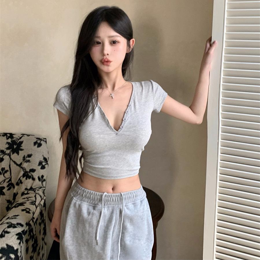 Женская однотонная футболка с коротким рукавом, весна-лето, V-образный вырез, узкий короткий топ, блузка, пуловер, размер S-XXL