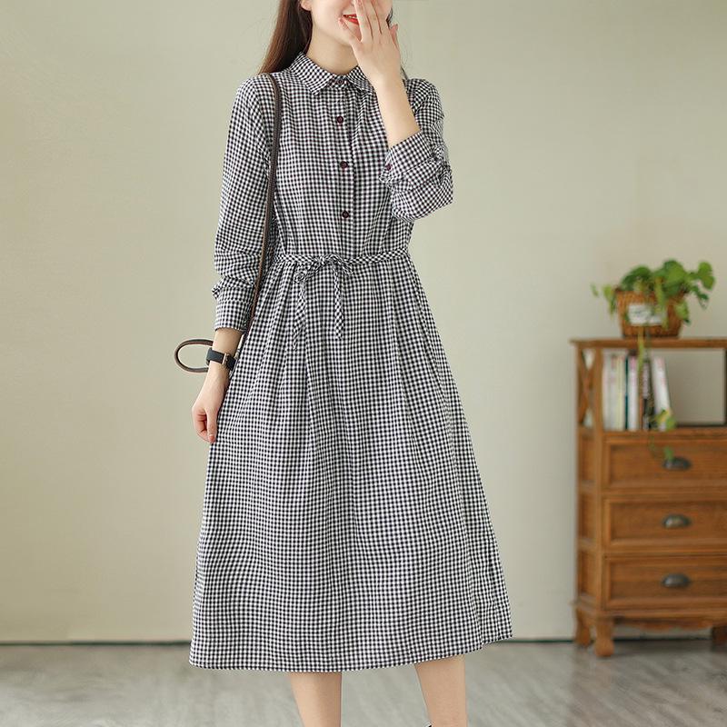 2025 осень новое ретро литературное среднее и длинное клетчатое хлопковое и льняное платье с тонкой талией рубашка юбка женская
