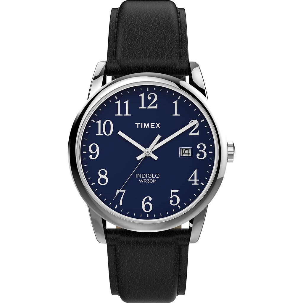 Timex EasyReader 38mm Leather Strap Watch, Black/Silver Tone/Blue. , Classic.