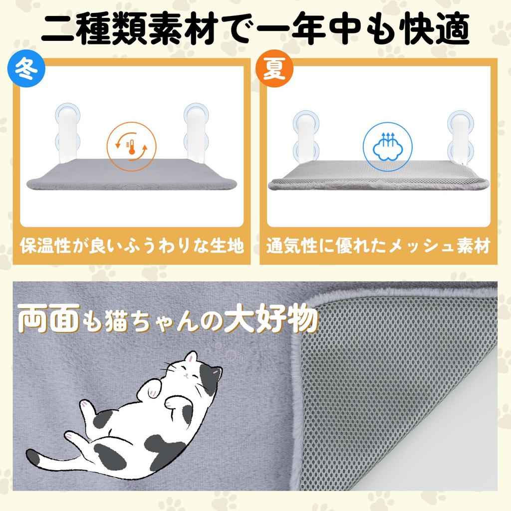 [Двусторонний тип, подходящий для всех сезонов и стирающийся] Гамак для кошек на окно изготовлен из двух типов материалов, которые любят кошки, что делает его подходящим для всех сезонов. Снаружи использована пушистая ткань с хорошим теплоудержанием для зимы, а внутри - сетчатый материал с отличной воздухопроницаемостью для лета, поэтому его можно комфортно использовать круглый год.. Чехол снимается на молнии, и его легко чистить, так как его можно мыть водой, даже если вашу кошку тошнит.