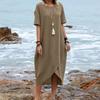 Новое женское однотонное хлопковое льняное винтажное платье миди с круглым вырезом и коротким рукавом для женщин