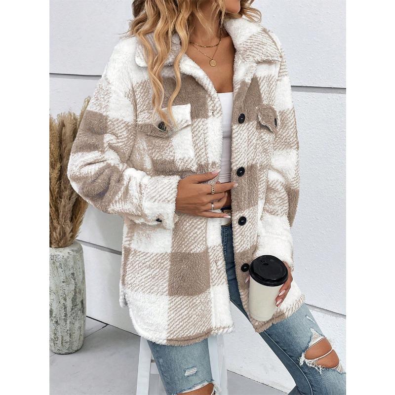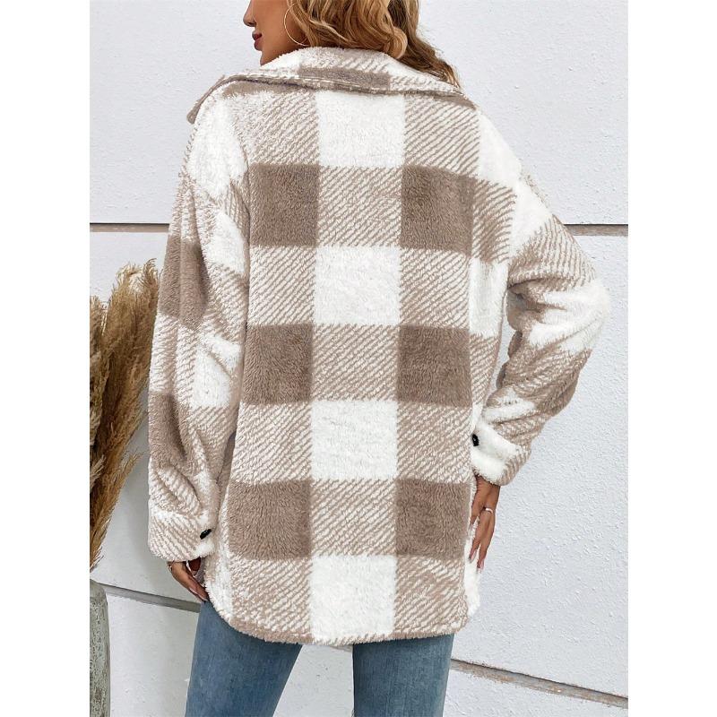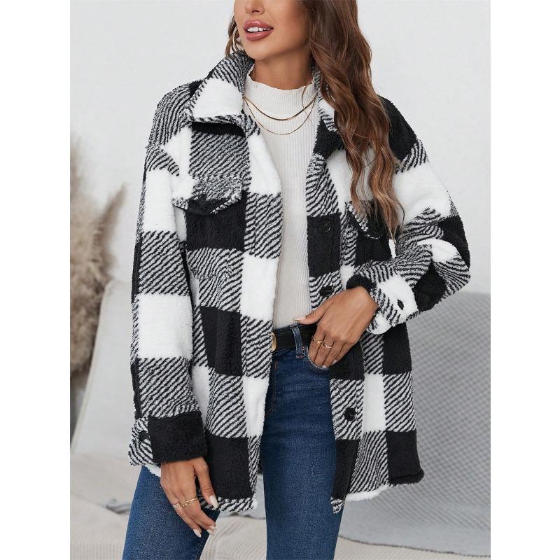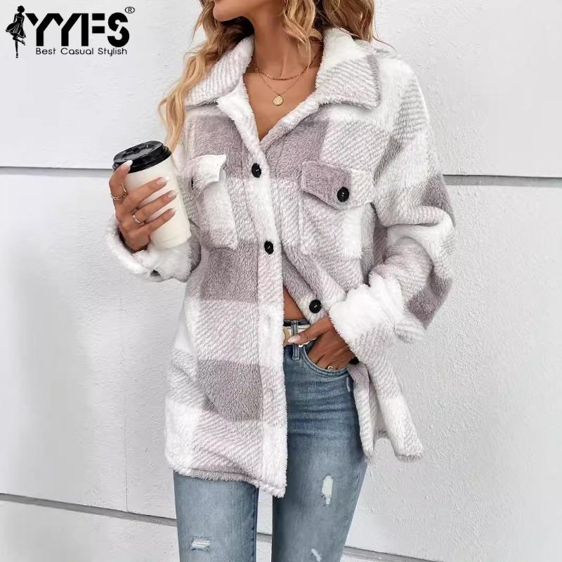 YYFS Женская мода, повседневные клетчатые принты, осенне-зимние куртки и пальто-поло с длинными рукавами и воротником