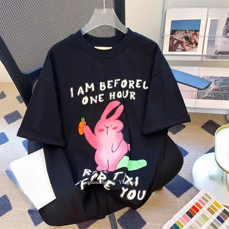 Летняя женская футболка свободного покроя с круглым вырезом и коротким рукавом с принтом кролика черного цвета — купить товар онлайн с бесплатной доставкой по всему миру!