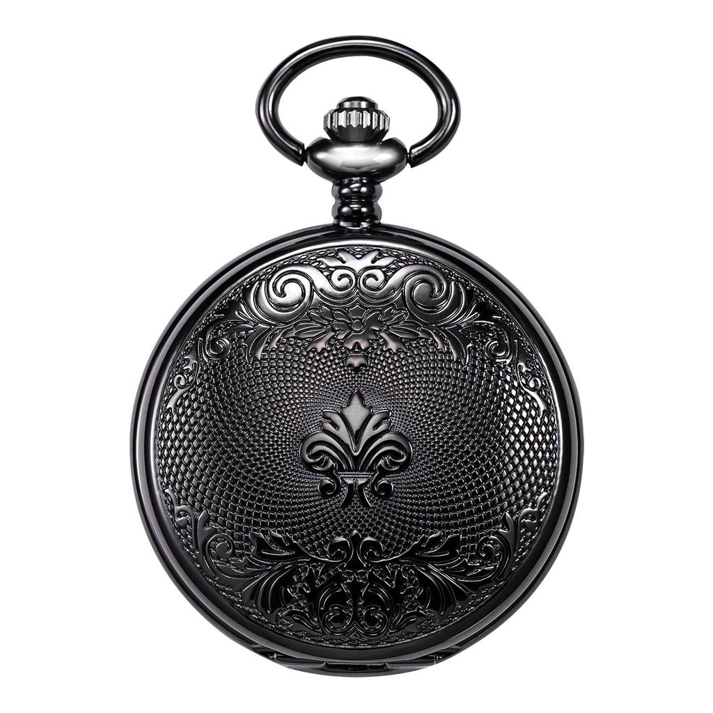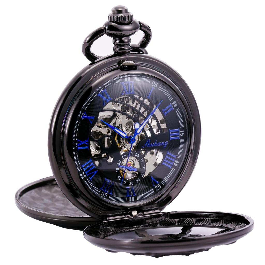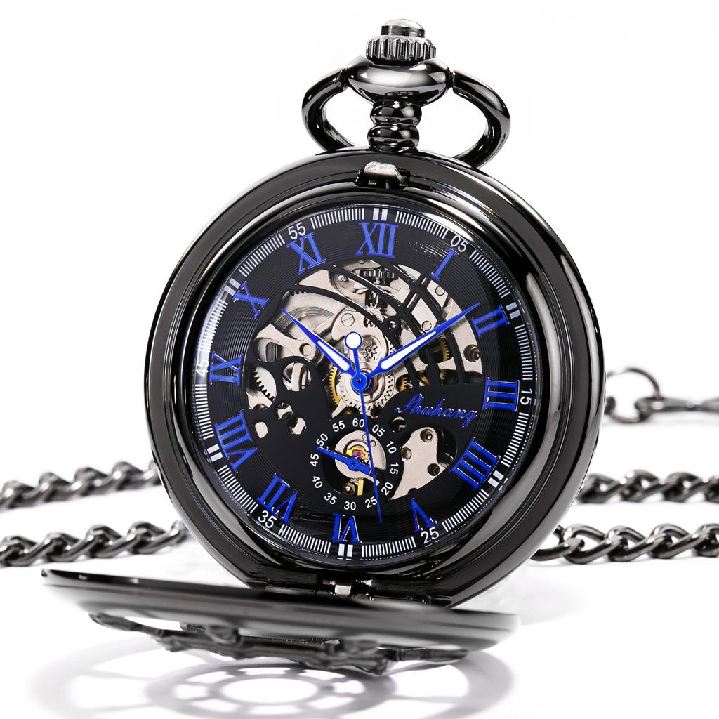 TREEWETO механические карманные часы антикварный корпус с лестницей скелетон римские цифры черный двойной охотник с цепочкой