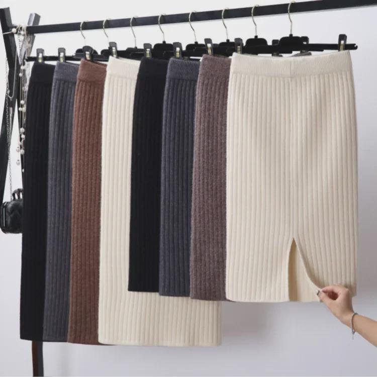 Юбка из шерстяного трикотажа с высокой талией в рубчик - женская осенне-зимняя корейская модель