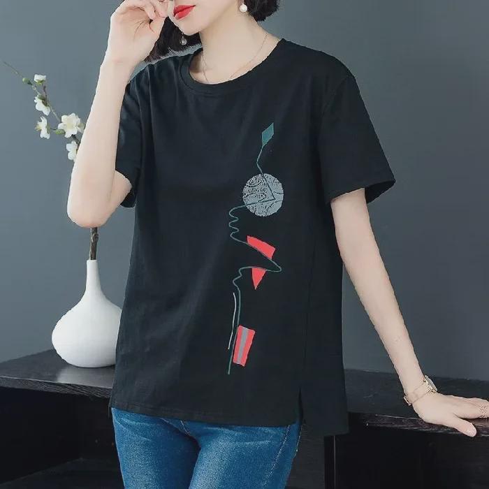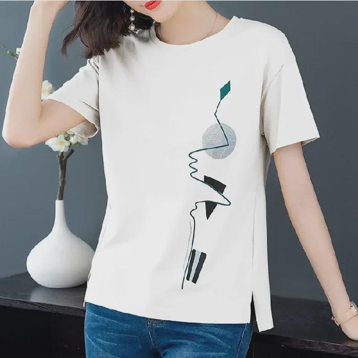 2025 Новая корейская свободная женская однотонная футболка с коротким рукавом и принтом, модный летний топ