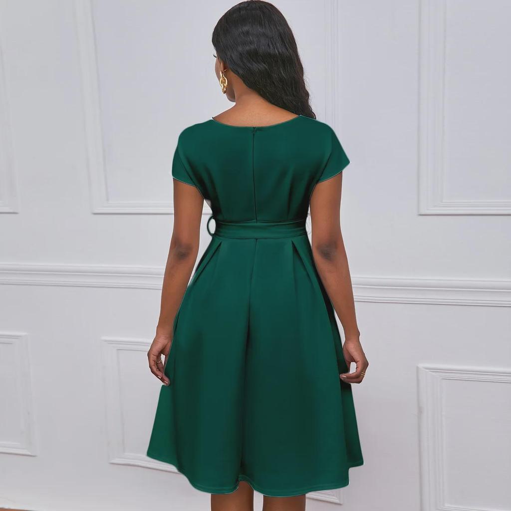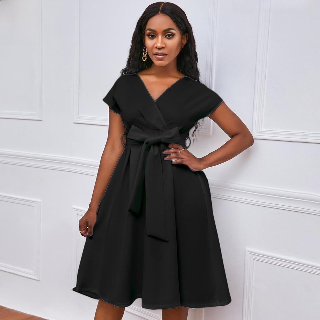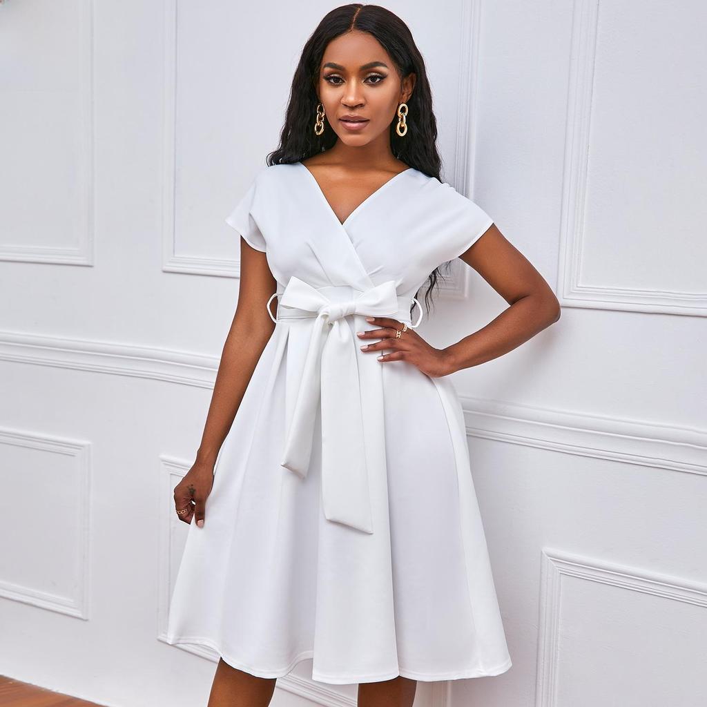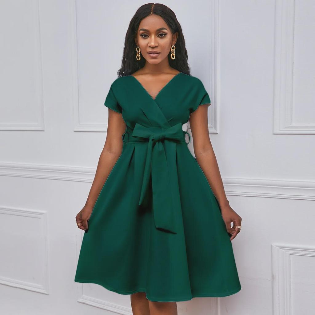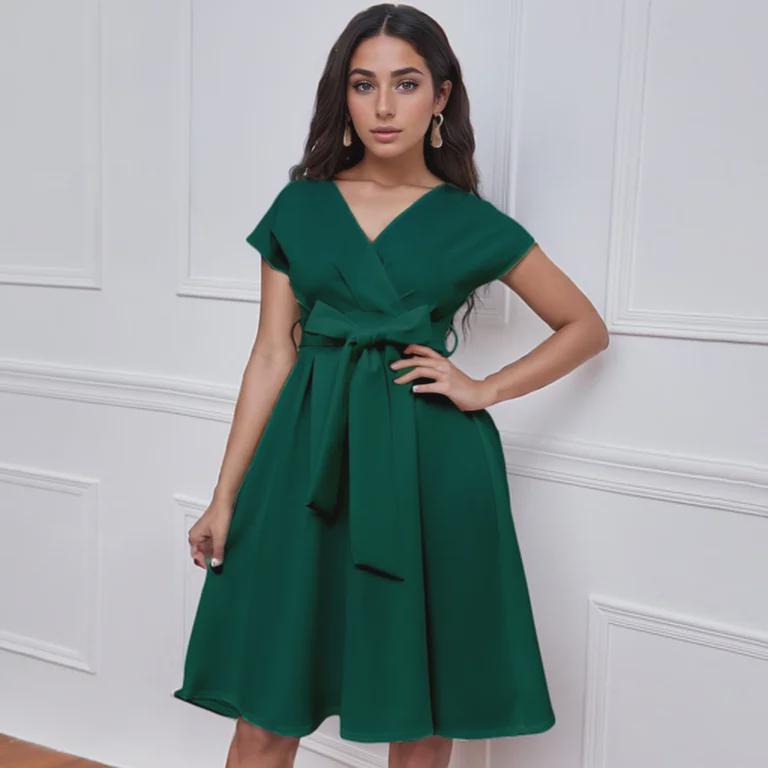 Ощутите непринужденную элегантность в этом шикарном свободном платье, идеально подходящем для случаев в теплую погоду.. Это платье, изготовленное из легкого полиэстера, обеспечивает комфорт и воздухопроницаемость, что делает его идеальным для европейских и американских ценителей моды.. Модель отличается привлекательным V-образным вырезом и стильным поясом-бабочкой, что добавляет женственности однотонной цветовой палитре.. Независимо от того, собираетесь ли вы на вечеринку в саду или наслаждаетесь отдыхом на природе, это платье обеспечит изящный силуэт, который одновременно моден и универсален.