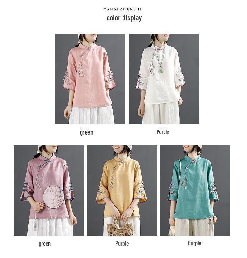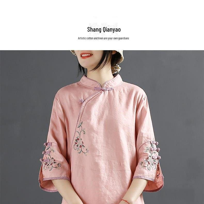 Эта женская рубашка в стиле ретро изготовлена из смеси хлопка и льна, обеспечивает комфорт и воздухопроницаемость, идеально подходит для весны и лета.. Стильный воротник-стойка и уникальный косой лацкан придают изделию привлекательный вид.. Застежка на пуговицы добавляет классический штрих, а сложная вышивка воплощает в себе непреходящую элегантность традиционного стиля чаепития.. Эта рубашка гармонично сочетает в себе винтажный шарм и современную элегантность, что делает ее универсальным дополнением к любому гардеробу.
