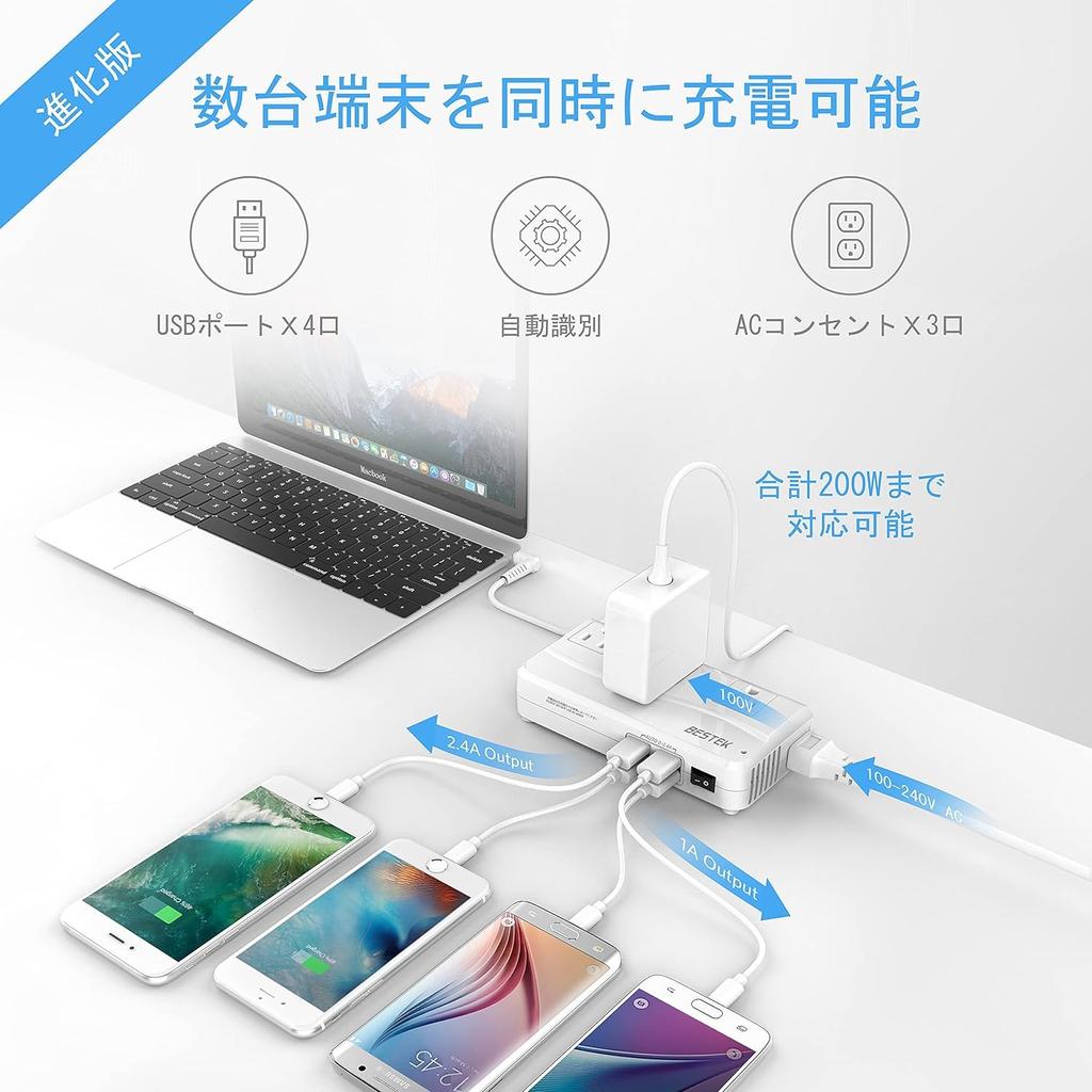 Трансформер для заграничных путешествий — компактный, портативный, со съемным шнуром, что очень удобно брать с собой в поездки за границу.. *Пожалуйста, не используйте этот продукт в Японии.. ПОЖАЛУЙСТА, НЕ ИСПОЛЬЗУЙТЕ В ЯПОНИИ. *Допустимая потребляемая мощность составляет 200 Вт, поэтому, пожалуйста, следите за тем, чтобы общая потребляемая мощность используемого электрооборудования не превышала 200 Вт.. *Нельзя использовать фены.. *Пожалуйста, убедитесь, что мощность не превышает 200 Вт.