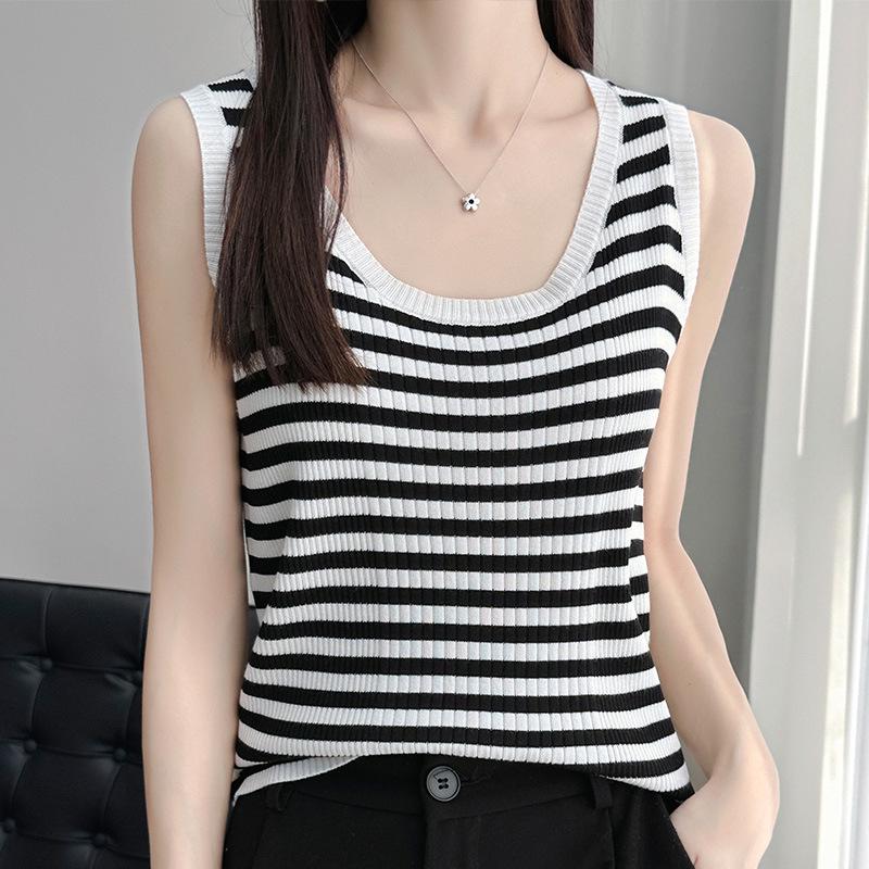 Женская летняя безрукавка из шелкового трикотажа Ice Silk Kint Camisole - Полосатый жилет с круглым вырезом — купить товар онлайн с бесплатной доставкой по всему миру!