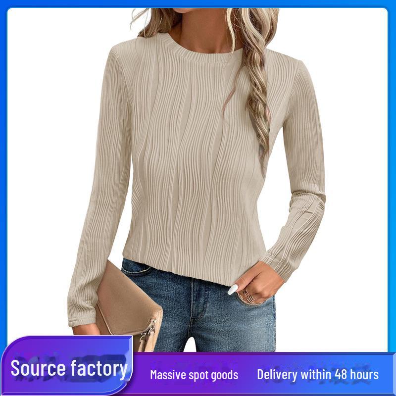 2024 Женская европейская и американская осенняя приталенная однотонная футболка с длинным рукавом и круглым вырезом